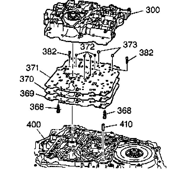 5. Remove the spacer plate assembly (370) with the two screen/seal assemblies (382) and the gaskets (369, 371) from the valve body (300).