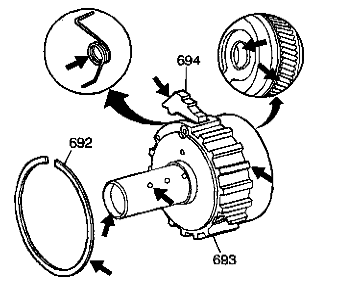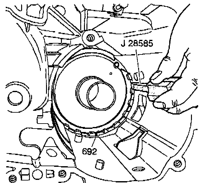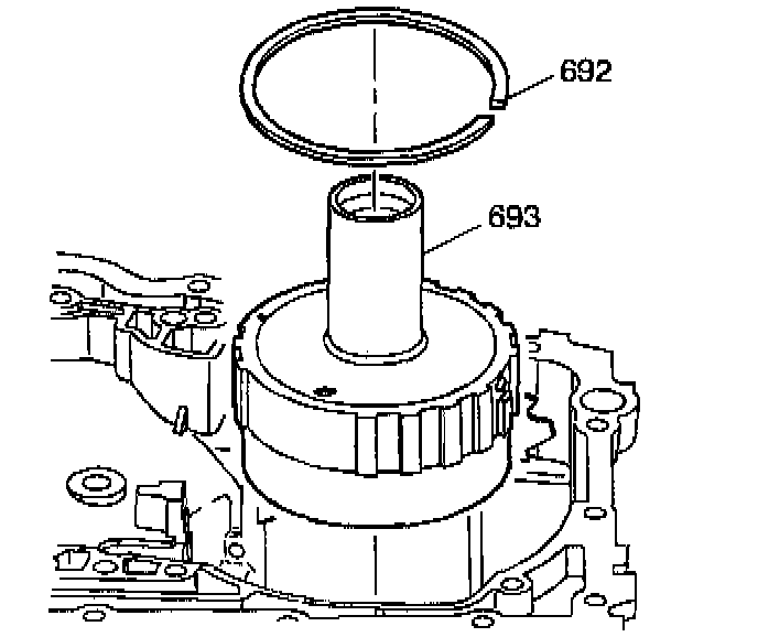 3. Use J 28585 or a long screwdriver in order to install the snap ring (692) into the case.