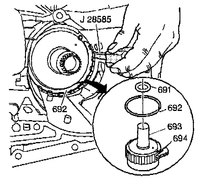 2. Use J 28585 or a large screwdriver in order to remove the differential carrier internal gear snap ring (692).