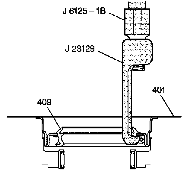 Use J 23129 and J 6125-1B in order to remove the oil seal assembly (409) from the case cover (401).
