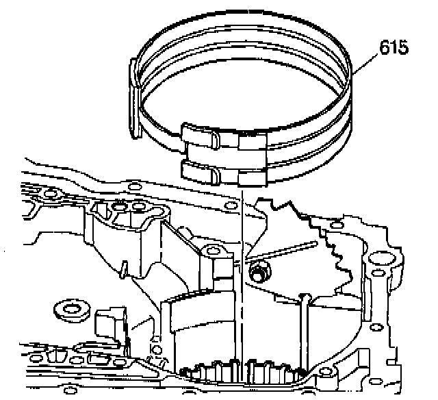 in order to disengage the band from the anchor pin in the case. Remove the reverse band assembly (615).