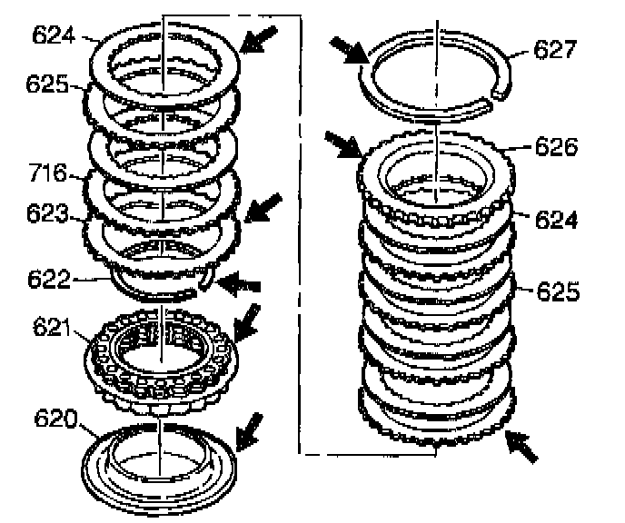 3. Inspect the steel plates (625) and the apply plate (716) of the second clutch for wear.