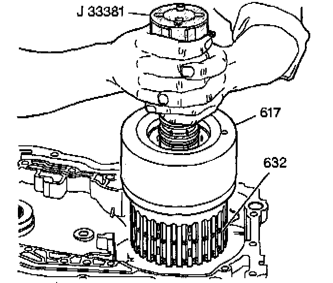 2. Install J 33381-A into the second clutch housing assembly (617).