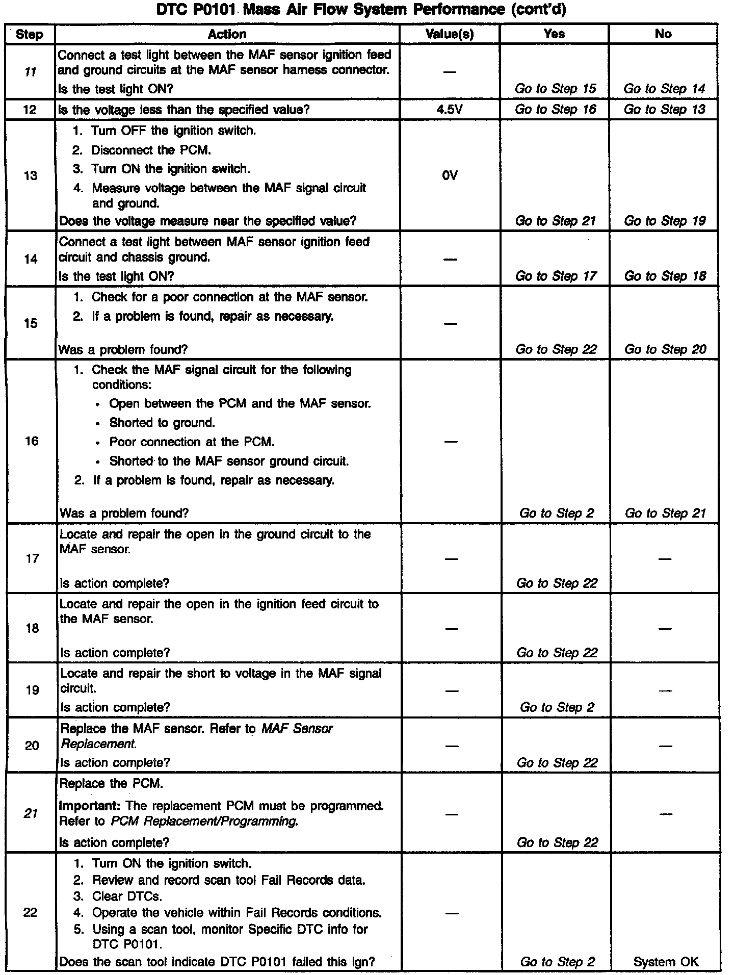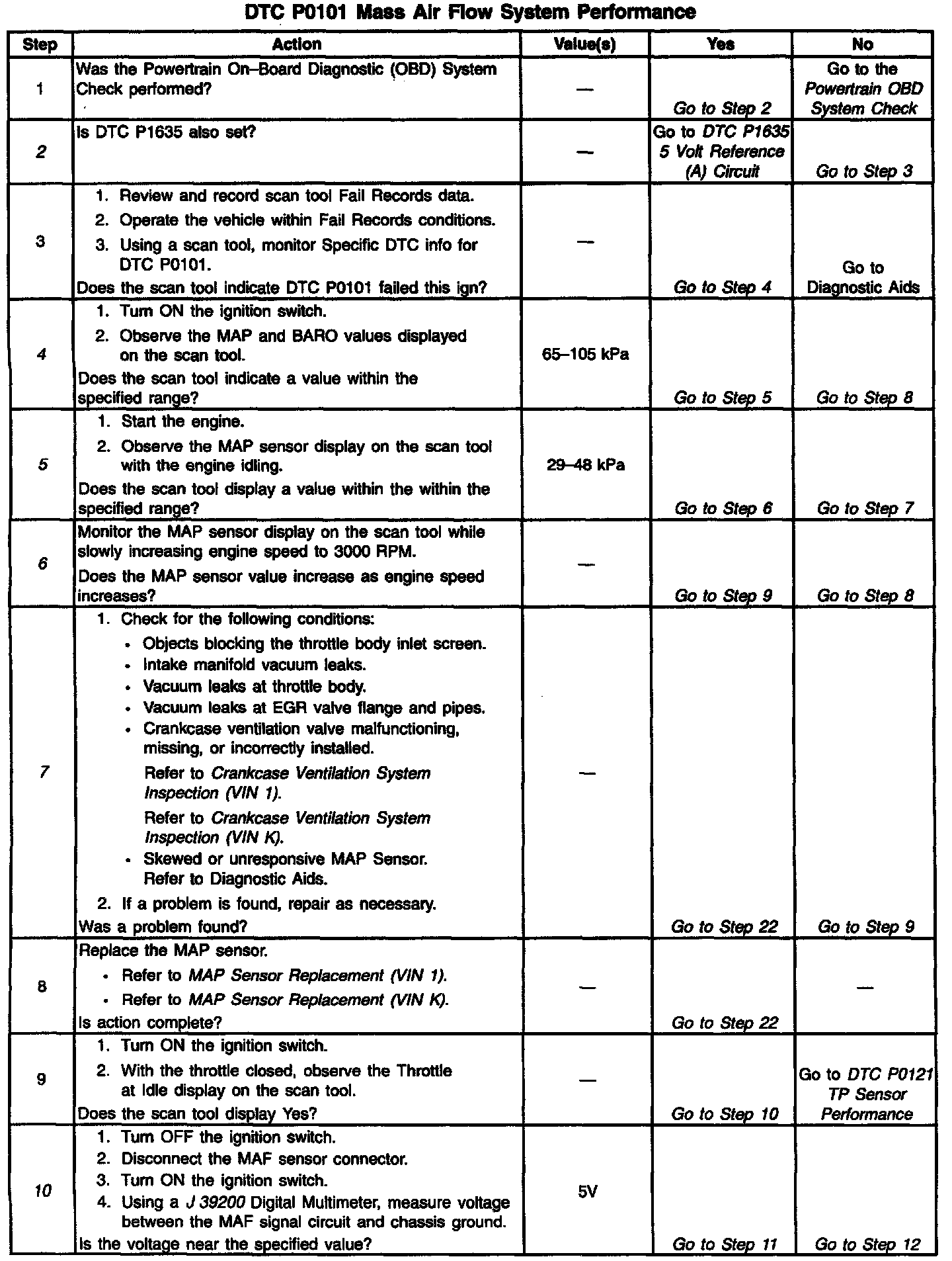 4. This step verifies a proper MAP/ BARO value at initial key ON. If the MAP sensor is stuck the barometric pressure value will be incorrectly calculated. This will cause the predicted Mass Air Flow calculations to be inaccurate. DTC P0101 will set if the MAF sensor signal does not match the predicted MAF value.