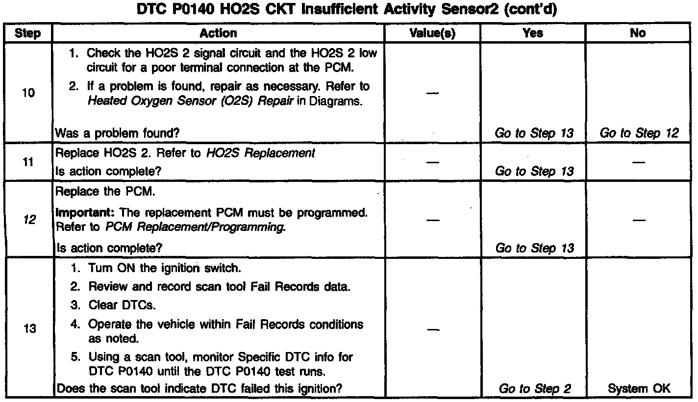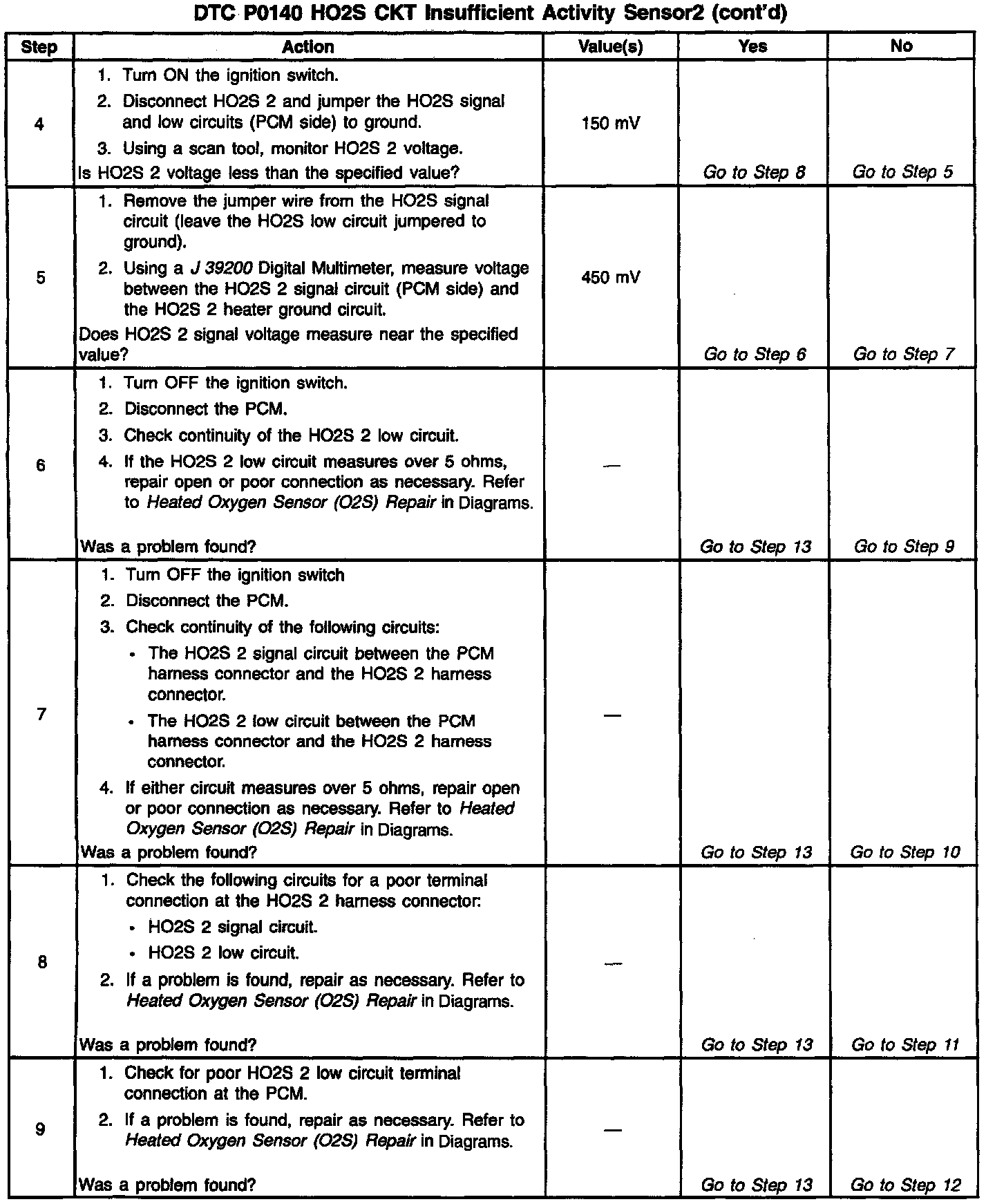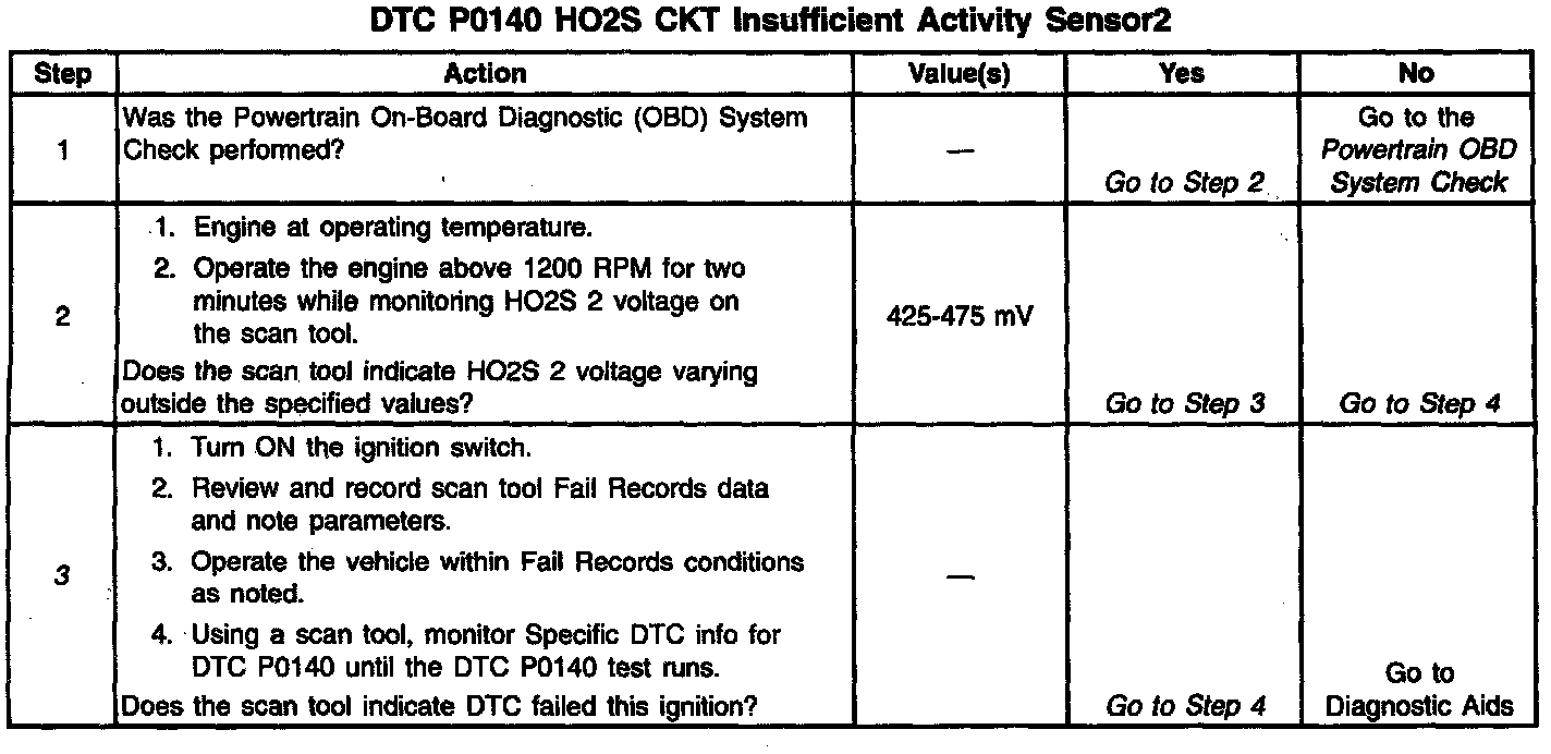 The PCM supplies a bias voltage of about 450 mV between the HO2S signal and low circuits. When measured with a 10 megohm digital voltmeter, this may display as low as 320 mV. The oxygen sensor varies the voltage within a range of about 1000 mV when the exhaust is rich, down through about 10 mV when exhaust is lean. The PCM constantly monitors the HO2S signal during closed loop operation and compensates for a rich or lean condition by decreasing or increasing injector pulse width as necessary. If the HO2S 2 voltage remains at or near the 450 mV bias for an extended period of time, DTC P0140 will be set, indicating an open sensor signal or sensor low circuit.