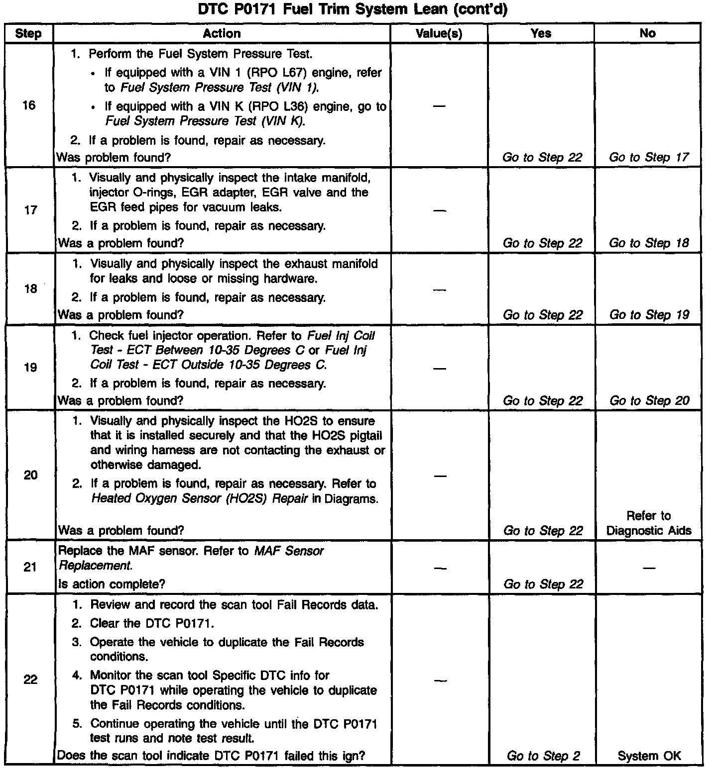 4. If the DTC P0171 test passes while the Fail Records conditions are being duplicated, the lean condition is intermittent. Refer to DIAGNOSTIC AIDS for additional information on diagnosing intermittent conditions.