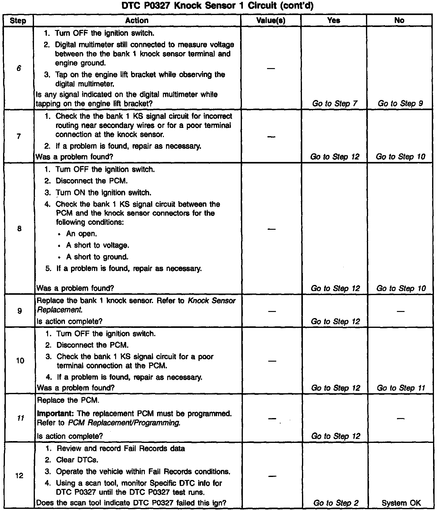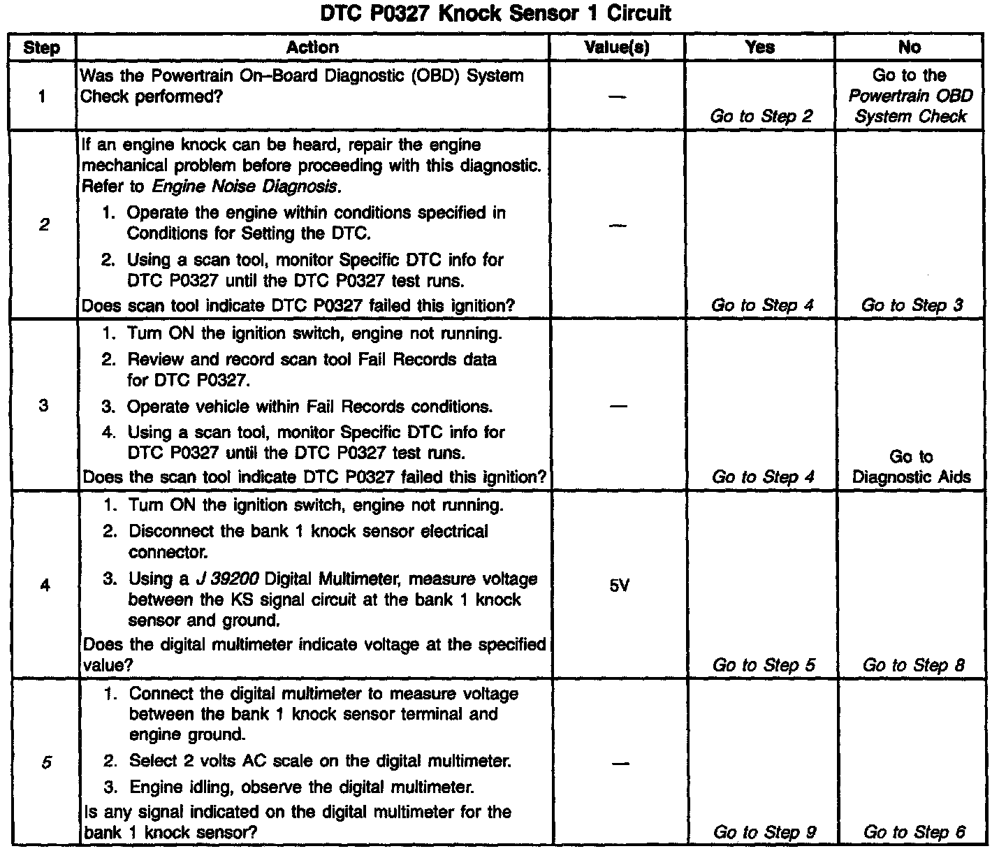 The PCM contains integrated Knock Sensor (KS) diagnostic circuitry. Input signals from the knock sensors are used to detect engine detonation, allowing the PCM to retard Ignition Control (IC) spark timing based on the amplitude and frequency of the KS signal being received. The knock sensors produce an Idle Air Control (IAC) signal under all engine operating conditions. During engine operation, the PCM calculates the average voltage of each knock sensor's signal. If the knock sensor system Is operating normally, the PCM should monitor KS signal voltages varying over 0.5 volt above and below the calculated average voltage. If the PCM detects a Knock Sensor 1 signal voltage within the calculated average voltage range, DTC P0327 will set.