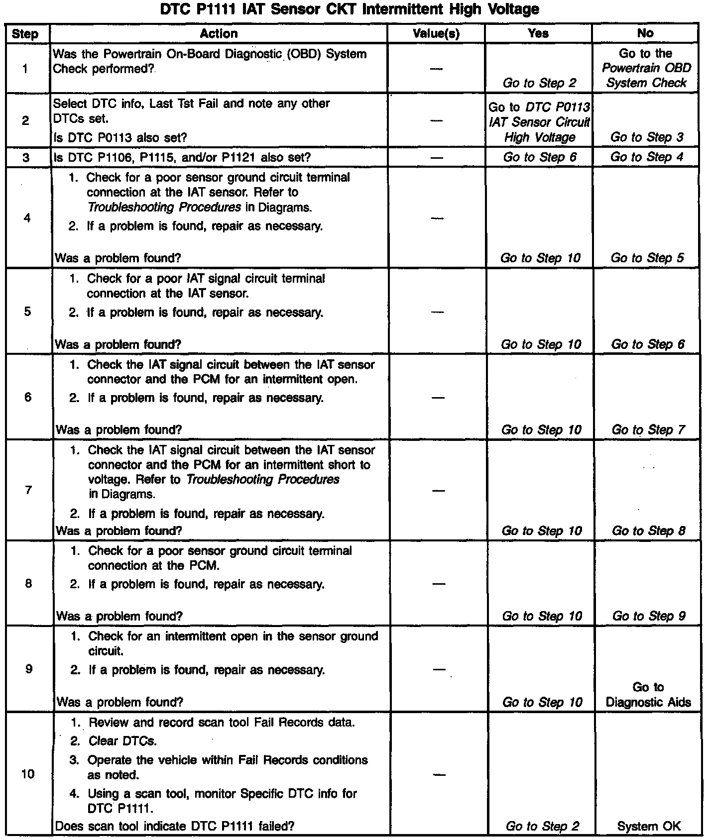 The Intake Air Temperature (IAT) sensor is a thermistor which measures the temperature of the air entering the engine. The PCM applies 5 volts through a pull-up resistor to the Intake Air Temperature (IAT) sensor. When the intake air is cold, the sensor resistance is high and the PCM will monitor a high signal voltage on the IAT signal circuit. It the intake air is warm, the sensor resistance is lower causing the PCM to monitor a lower voltage. DTC Phil will set when the PCM detects an intermittently high signal voltage on the intake air temperature sensor signal circuit.