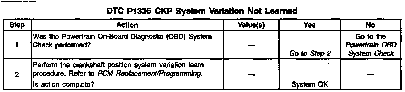 The crankshaft position system variation values are stored in the PCM no-volatile memory after a learn procedure has been performed. DTC P1336 set indicates that the crankshaft position system variation values have not been stored in the PCM and the crankshaft position system variation learn procedure must be performed. The learn procedure is required after the following service procedures have been performed, regardless of whether or not DTC P1336 is set:
