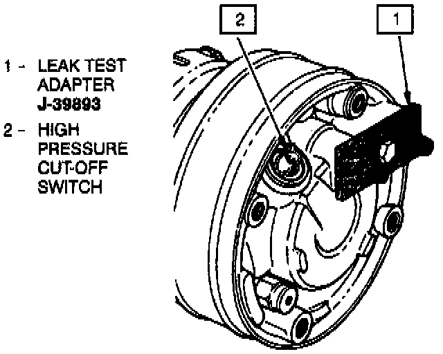 3. Using leak detector J 39400, check for leaks at pressure relief valve, rear head switch location, compressor front and rear head seals, through bolt head gaskets and compressor shaft seal.