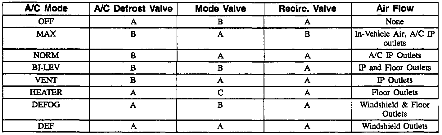 Check operation of valves using following chart. Adjust Blower Speed to HI to give a strong air flow (engine warm and running at idle).