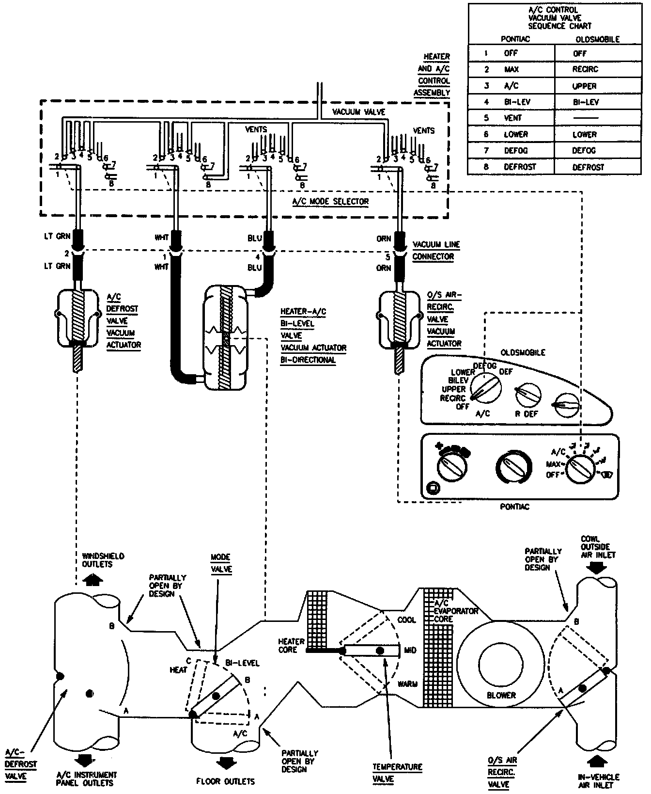 ^ If no valves operate, check violet hose for vacuum at the heater and A/C Control. If vacuum is not present, check hose back to engine vacuum source for pinching or leaks.