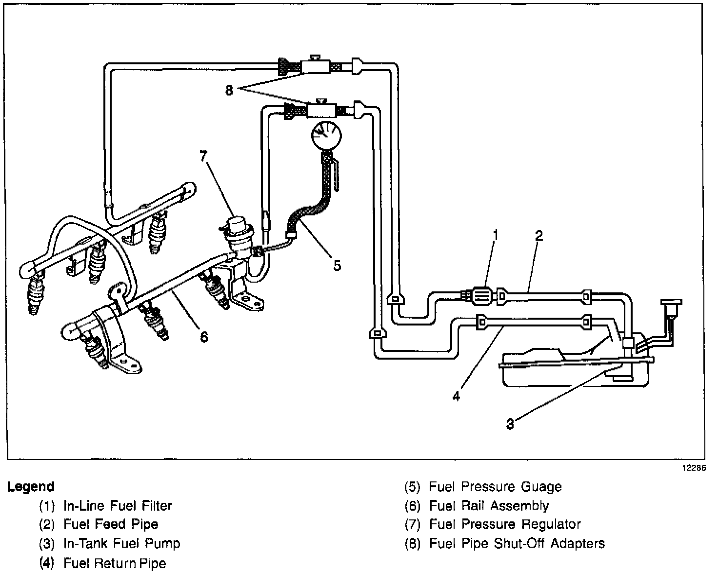 When the ignition switch is turned ON, the Powertrain Control Module (PCM) will turn ON the in-tank fuel pump. The in-tank fuel pump will remain ON as long as the engine is cranking or running and the PCM is receiving reference pulses. If there are no reference pulses, the PCM will turn the in-tank fuel pump OFF 2 seconds after the ignition switch is turned ON or 2 seconds after the engine stops running. The in-tank fuel pump is an electric pump, attached to the Fuel Sender Assembly. The in-tank fuel pump supplies fuel through the fuel feed pipe, and in-line fuel filter to the Fuel Rail Assembly. The fuel pump is designed-to provide fuel at a pressure above the pressure needed by the fuel injectors. A fuel pressure regulator, attached to the Fuel Rail, keeps the fuel available to the fuel injectors at a regulated pressure. Unused fuel is returned to the fuel tank by a separate fuel return pipe. The fuel pressure gauge and fuel pipe shut-off adapters are used for fuel system diagnosis.