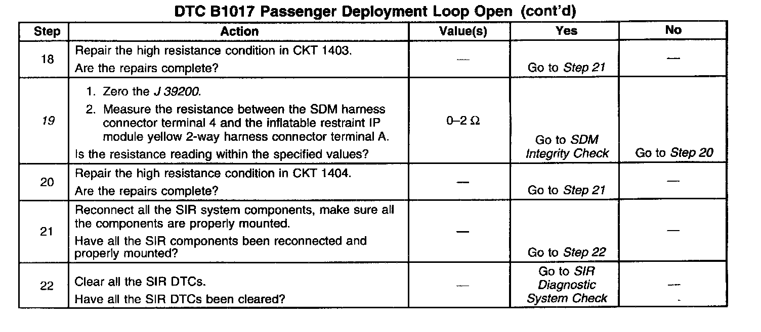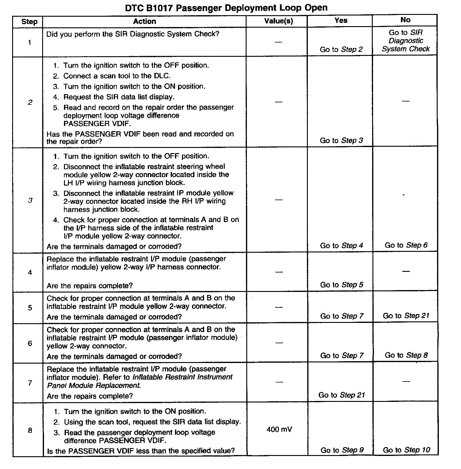 10. This test isolates the malfunction to one side of the Inflatable Restraint I/P module (passenger inflator module) yellow 2-way connector.