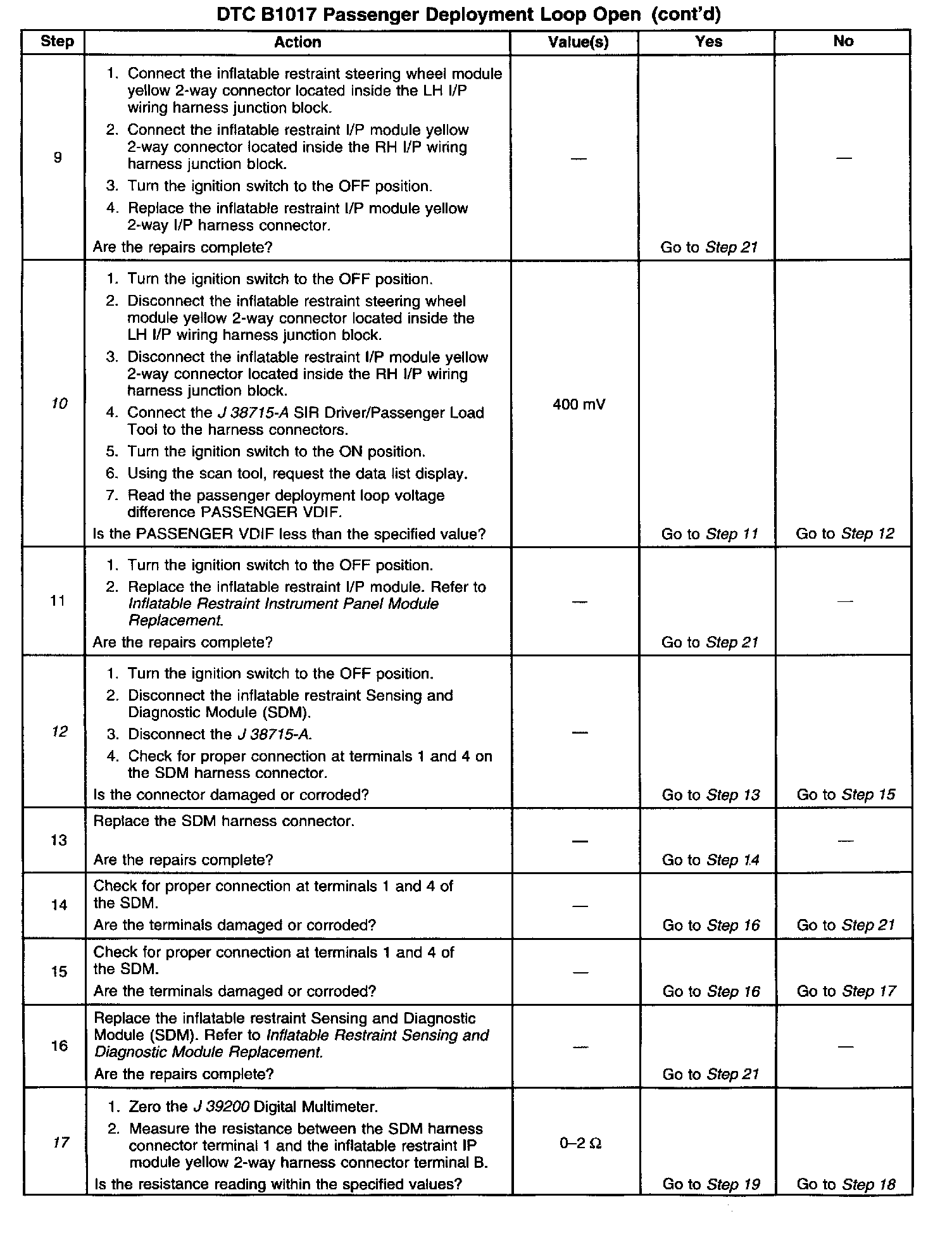 When measurements are requested in this table, use the J 39200 Digital Multi meter with the correct terminal adapter from the J 35616-A Connector Test Adapter Kit. When an inspection for proper connection is requested, refer to Intermittents and Poor Connections. When a wire, connector or terminal repair is requested, use the J 38125-B Terminal Repair Kit. Refer to Wiring Repair.