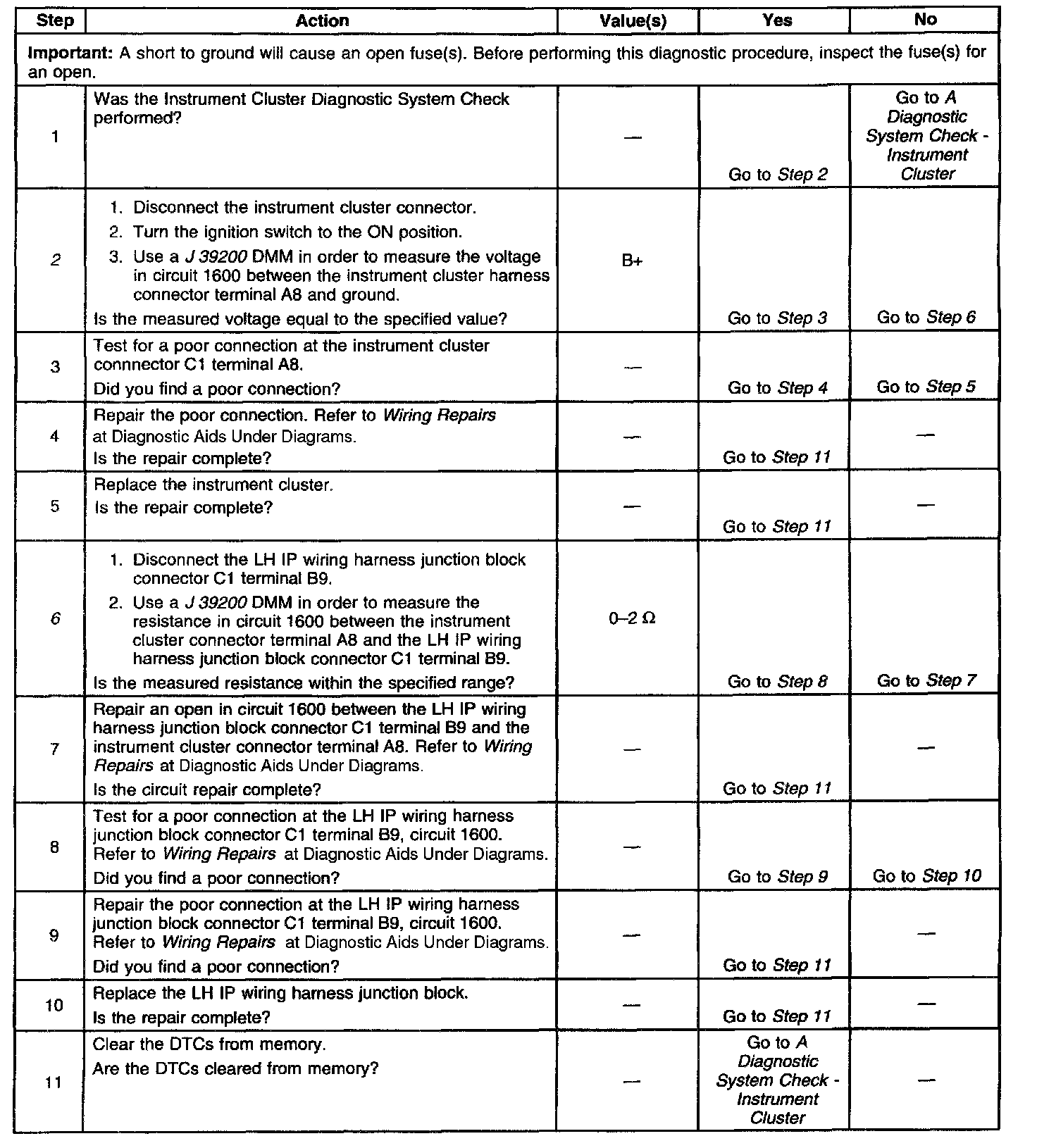 6. This determines whether an open exists in CKT 1600 between the instrument cluster and the LH IP wiring harness junction block.