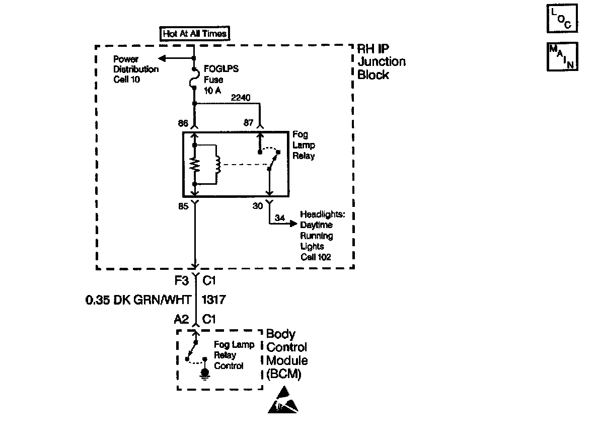 This circuit controls the front foglamp relay coil by grounding the circuit through the Body Control Module (BCM). This condition is a fault code (history and current) that is set if the front foglamp relay output is shorted to ground.