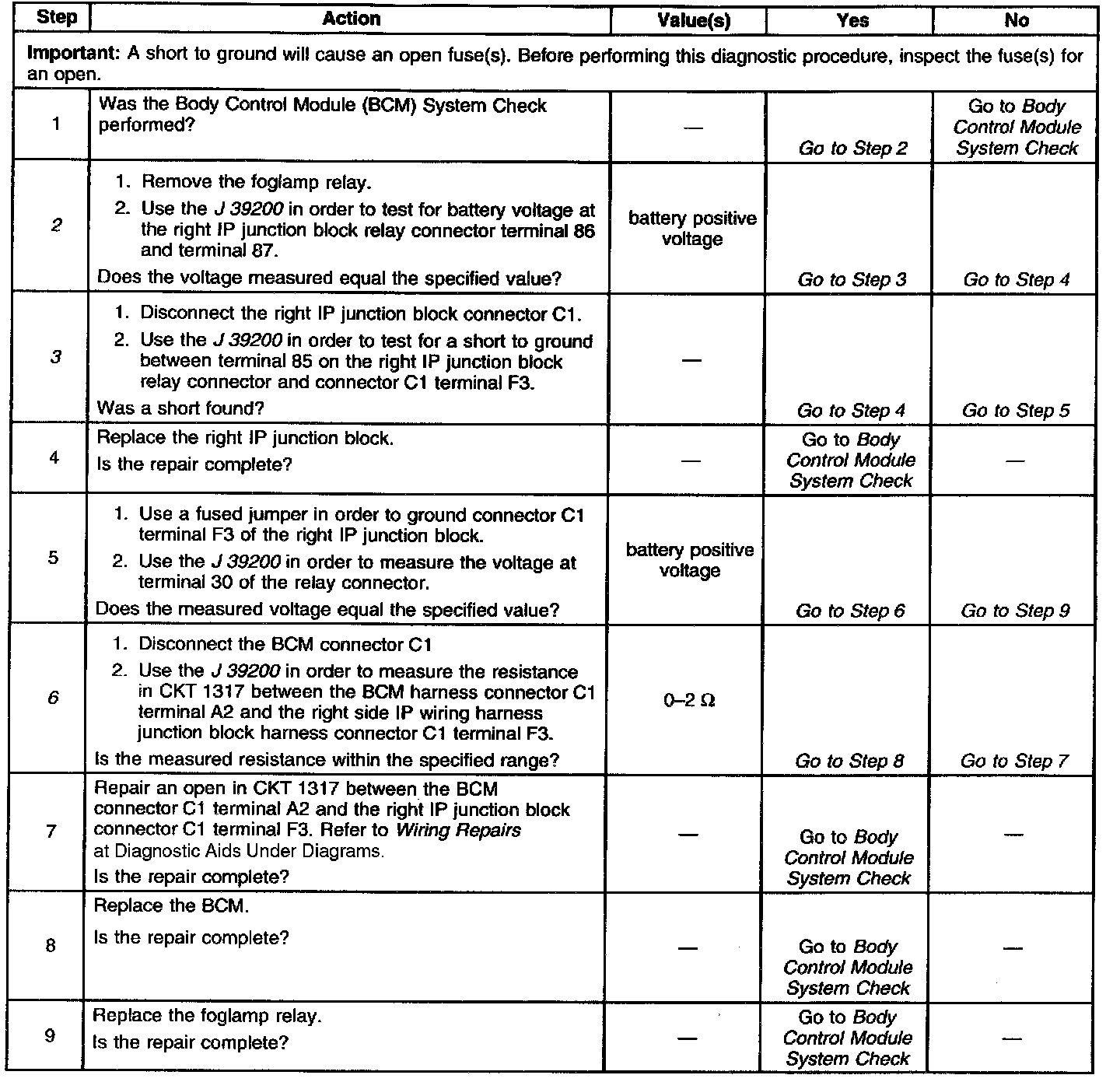 6. This step determines if a short to ground exists in CKT 1317 between the right IP junction block and the Body Control Module (BCM).