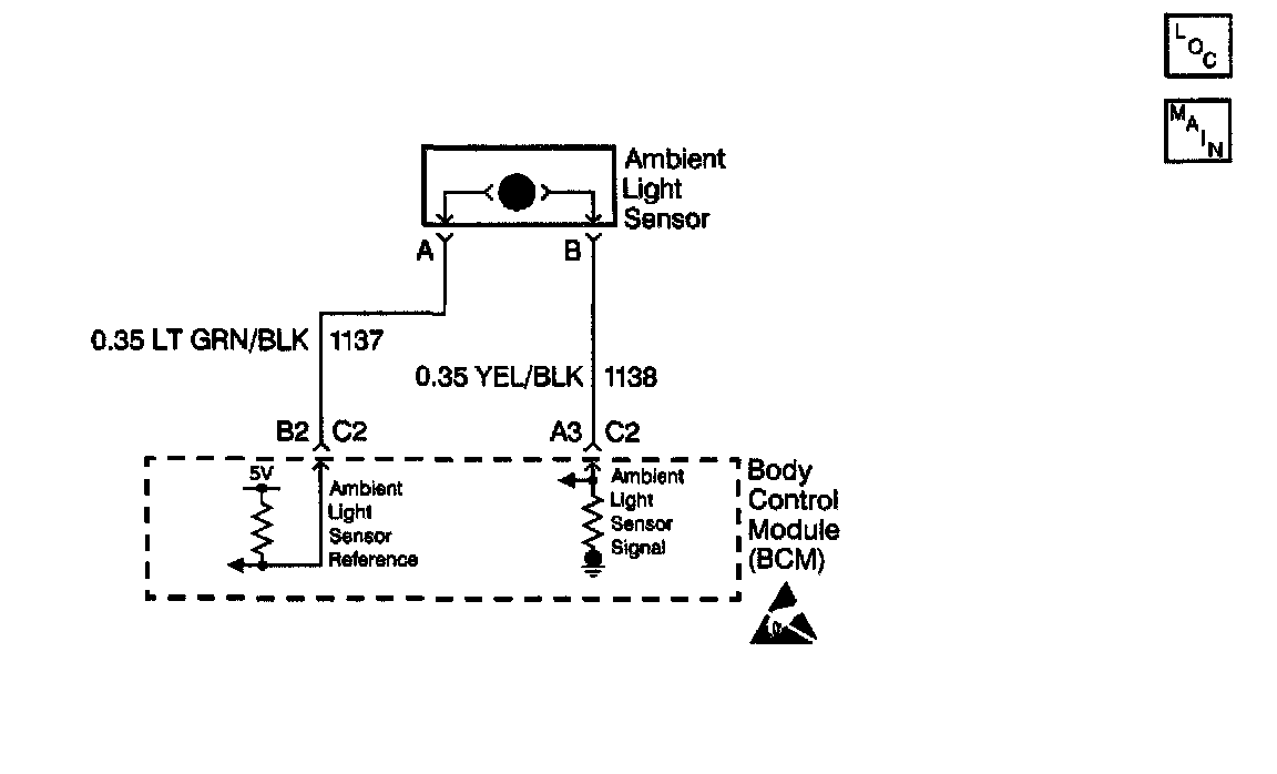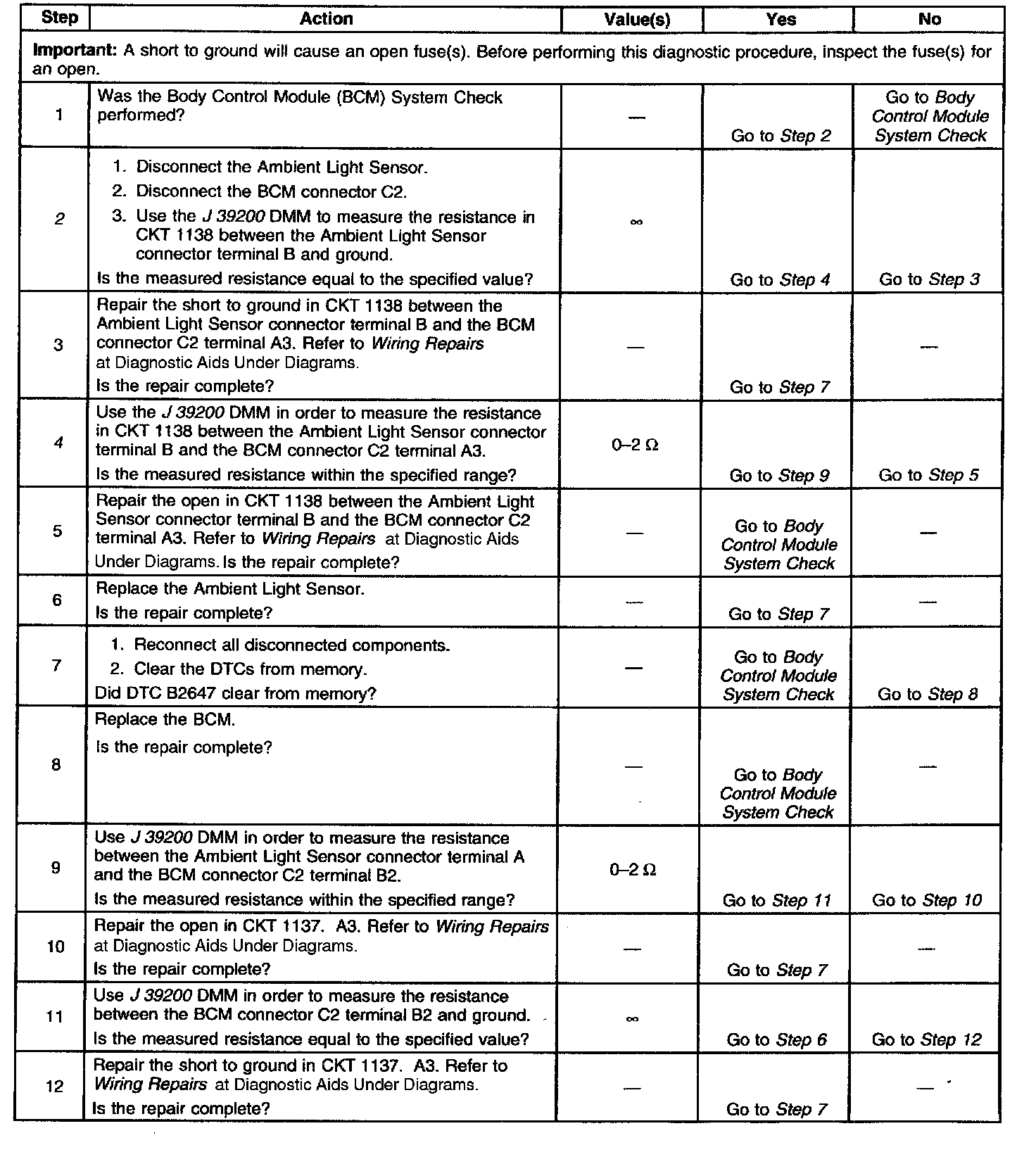 2. This step determines a short to ground in CKT 1138 between the Body Control Module (BCM) and the ambient light sensor.