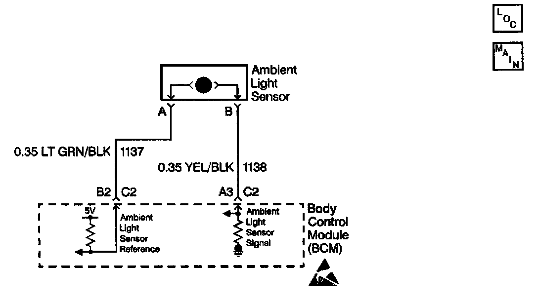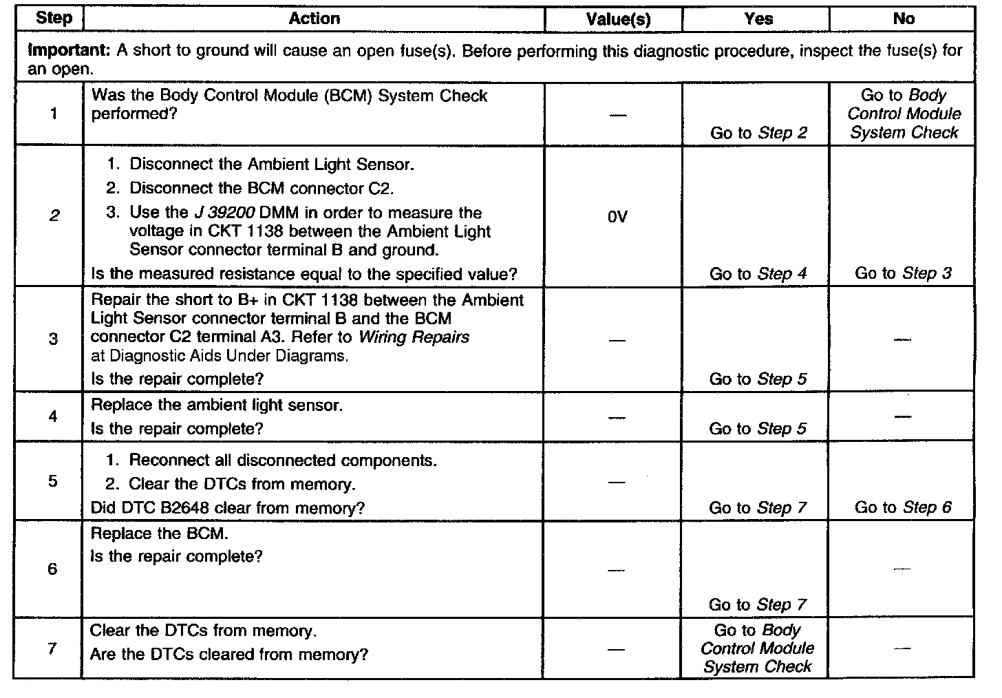 2. This step determines a short to battery in CKT 1138 between the Body Control Module (BCM) and the Ambient Light Sensor.