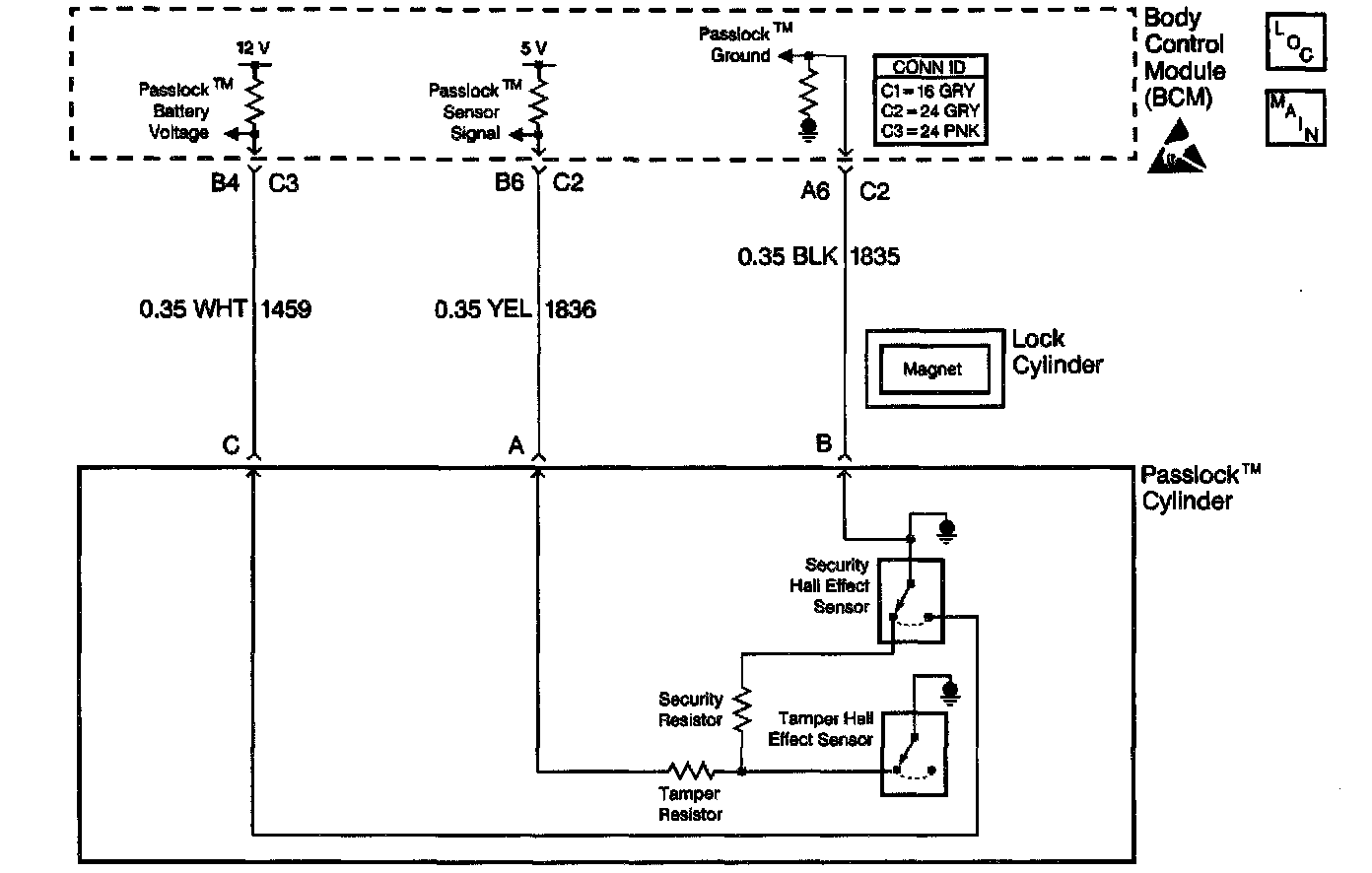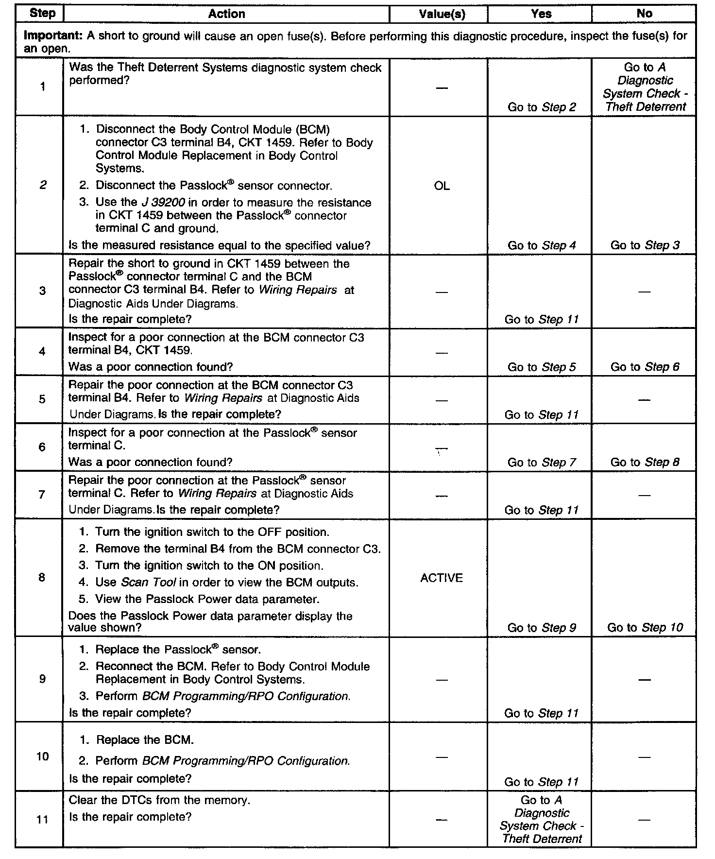 2. This step determines if a short to ground exists in CKT 1459 between the Body Control Module (BCM) and the Passlock sensor.