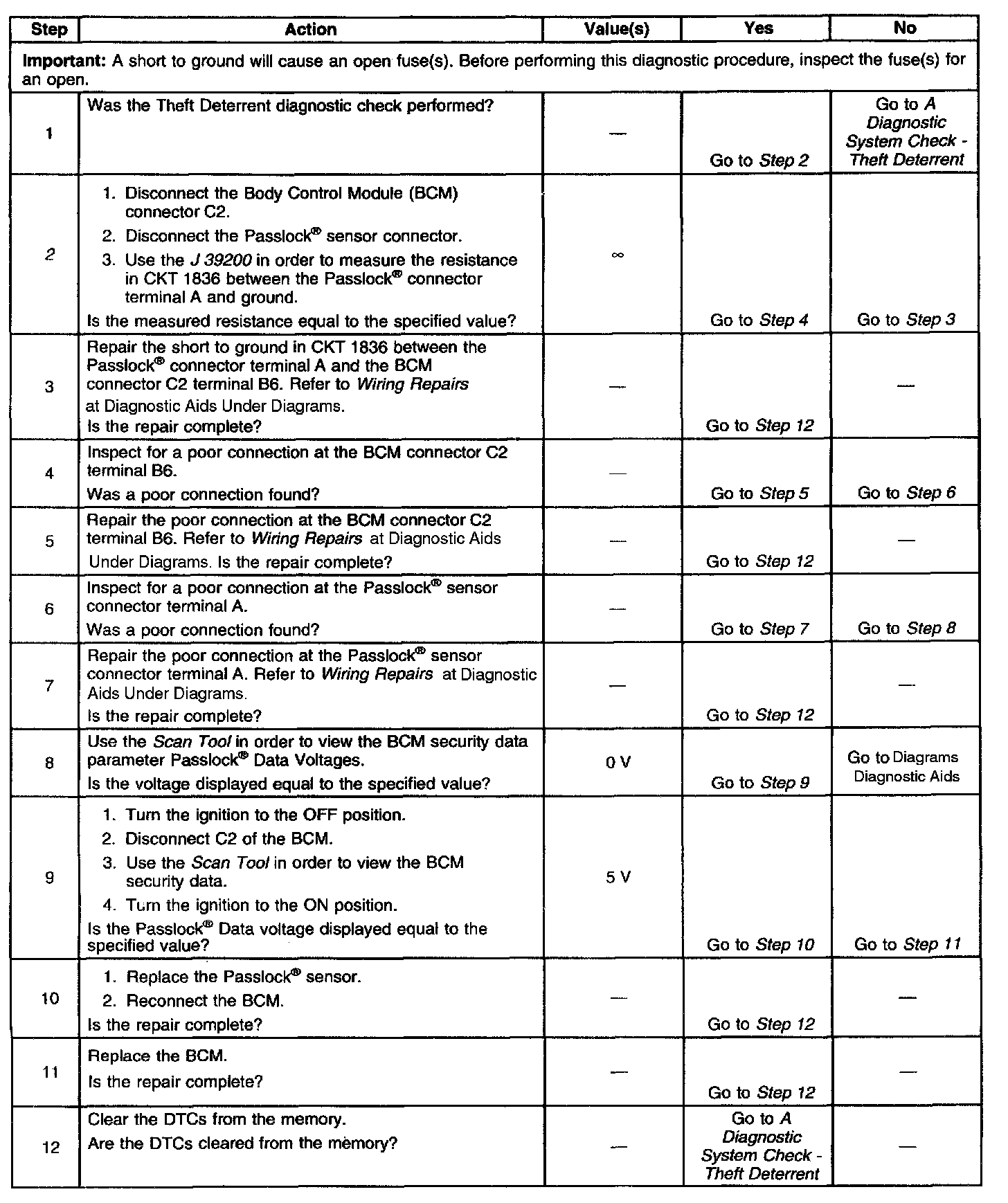 2. This step determines if a short to ground exists in CKT 1836 between the Body Central Module (BCM) and the Passlock sensor.
