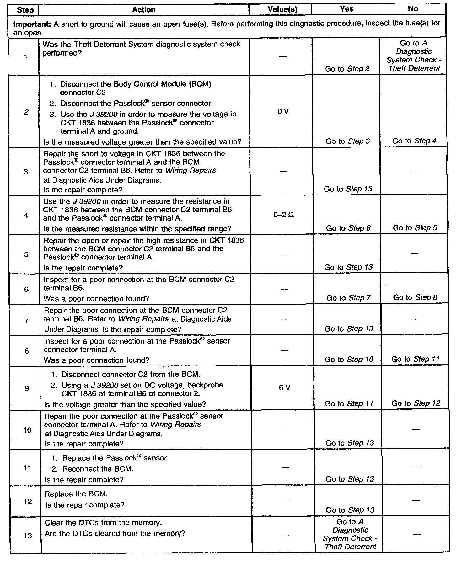 2. This step determines if a short to the battery exists in CKT 1836 between the Body Control Module (BCM) and the Passlock sensor.
