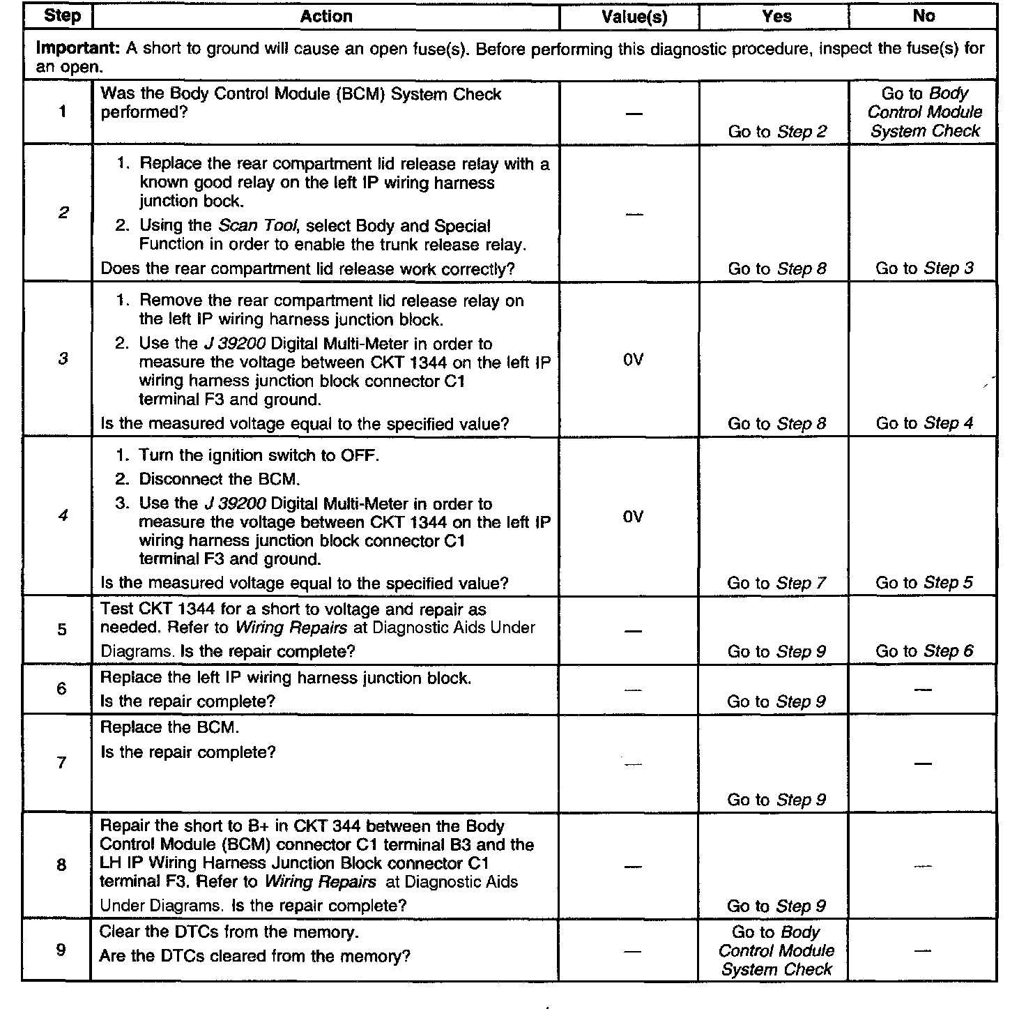 4. This step determines a short to battery in CKT 1344 between the left IP wiring harness junction block and the Body Control Module (BCM).
