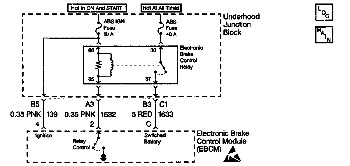 Ignition voltage is supplied to terminal 86 of the Electronic Brake Control Relay. The above condition enables the EBCM to energize the pull in coil by completing the ground circuit at connector terminal 2 of the EBCM. The magnetic field created closes the Electronic Brake Control Relay contacts. The magnetic field also allows battery voltage and current through the Electronic Brake Control Relay terminal 30 to be supplied to the EBCM through connector C1 terminal B3. Connector C1 terminal B3 supplies power to the EBCM, which supplies power to the motors and solenoids.