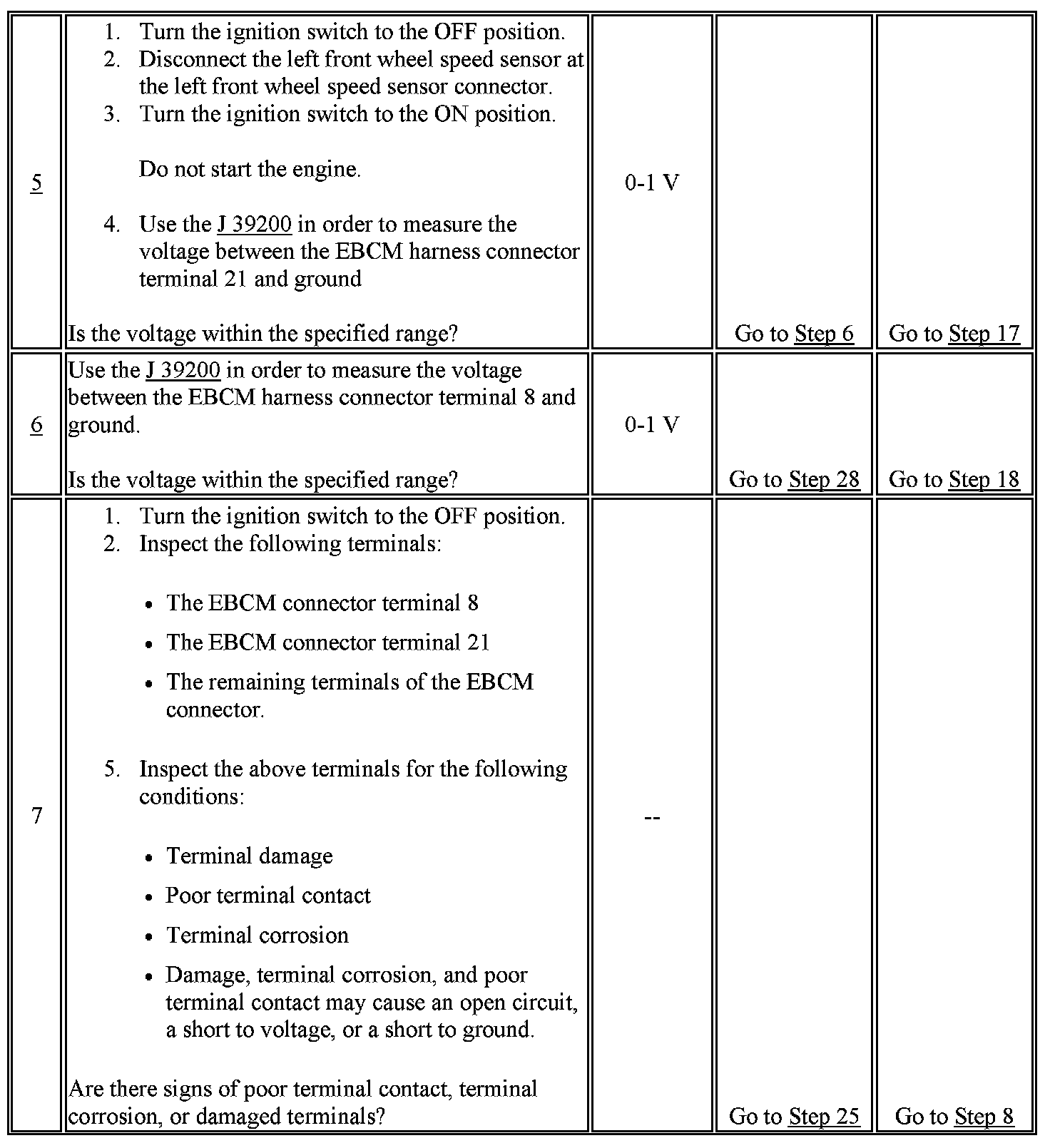5. This test determines if the wheel speed sensor signal low is shorted to voltage.