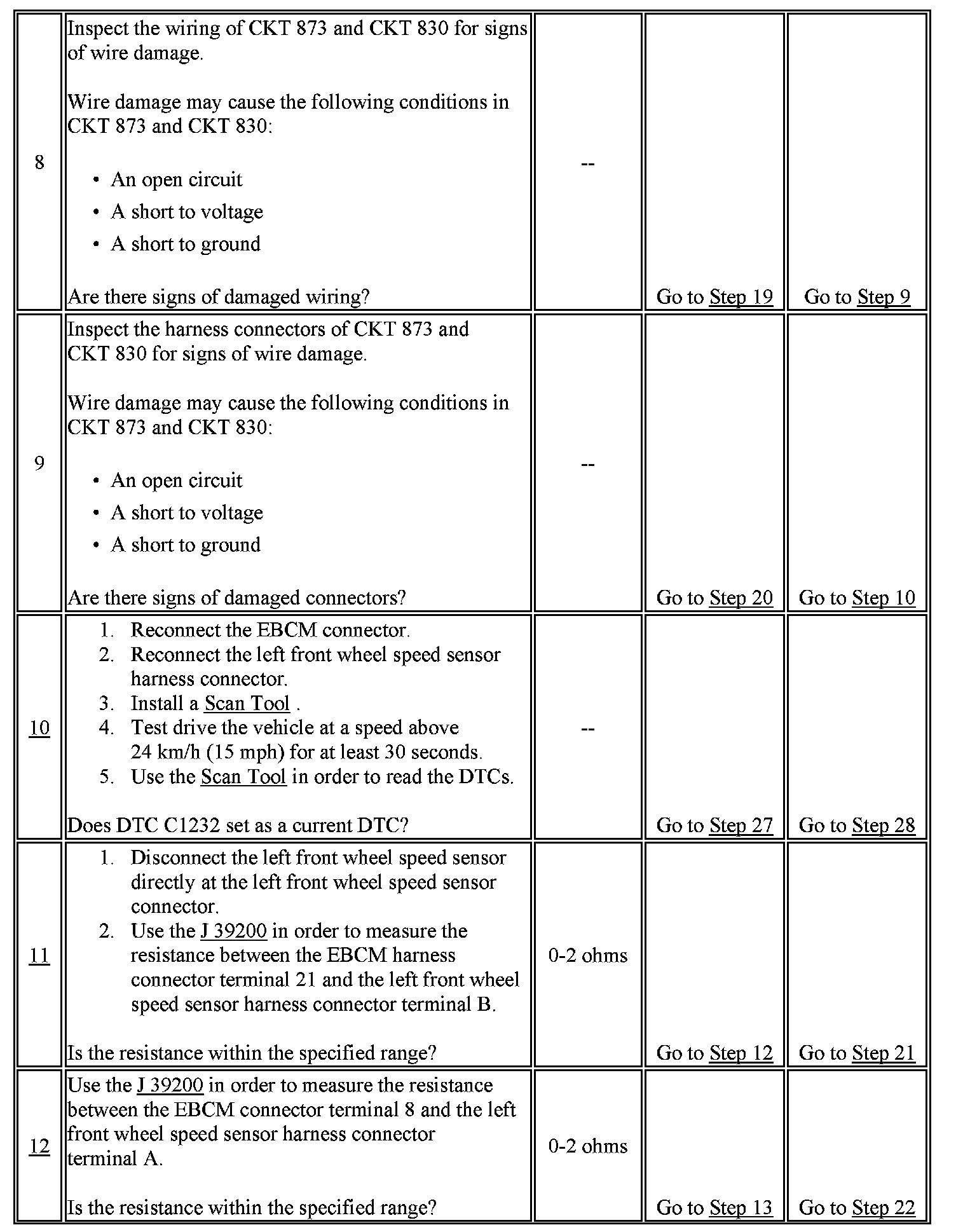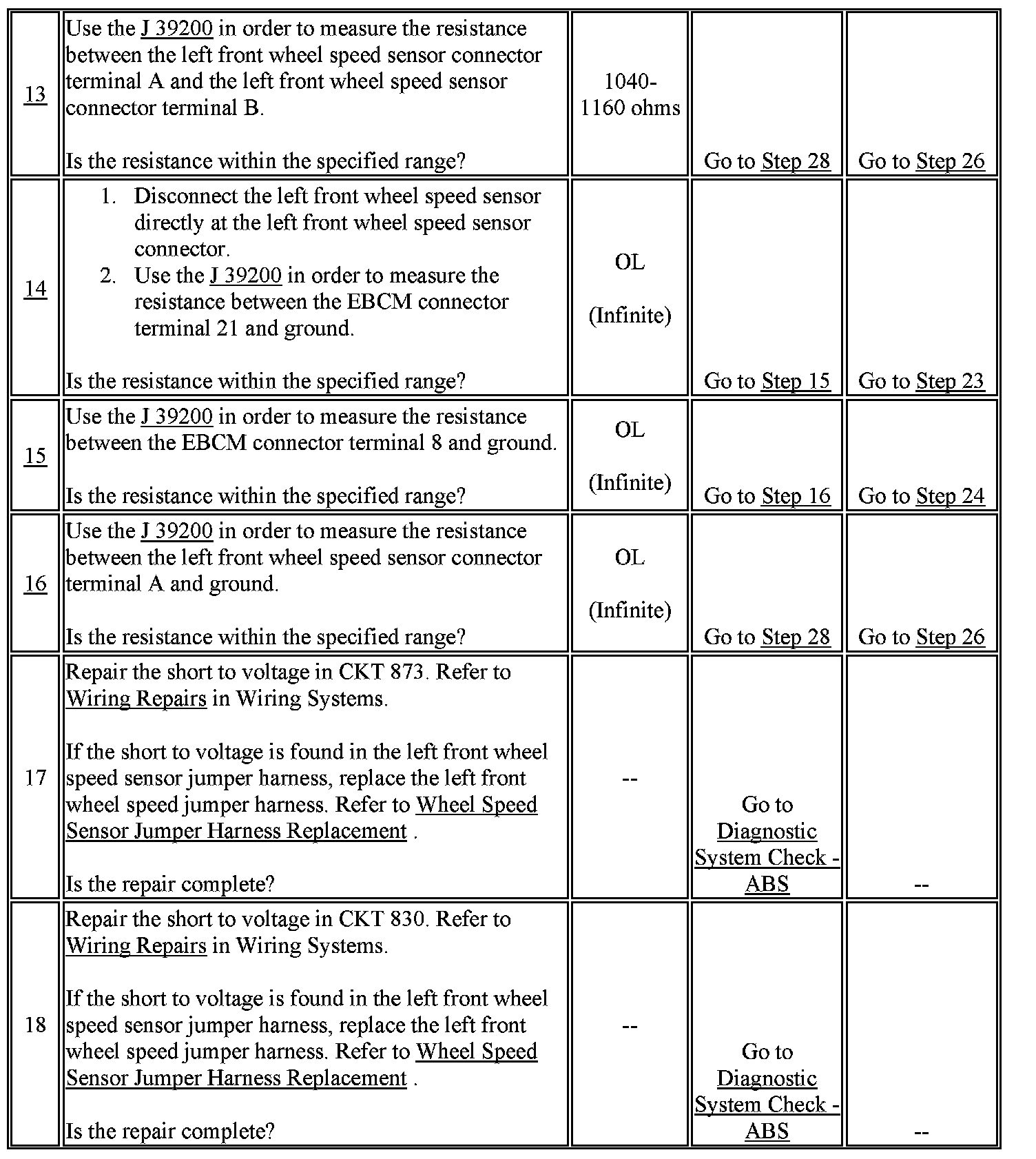 12. This test checks for an open or high resistance in the wheel speed sensor signal high circuit.