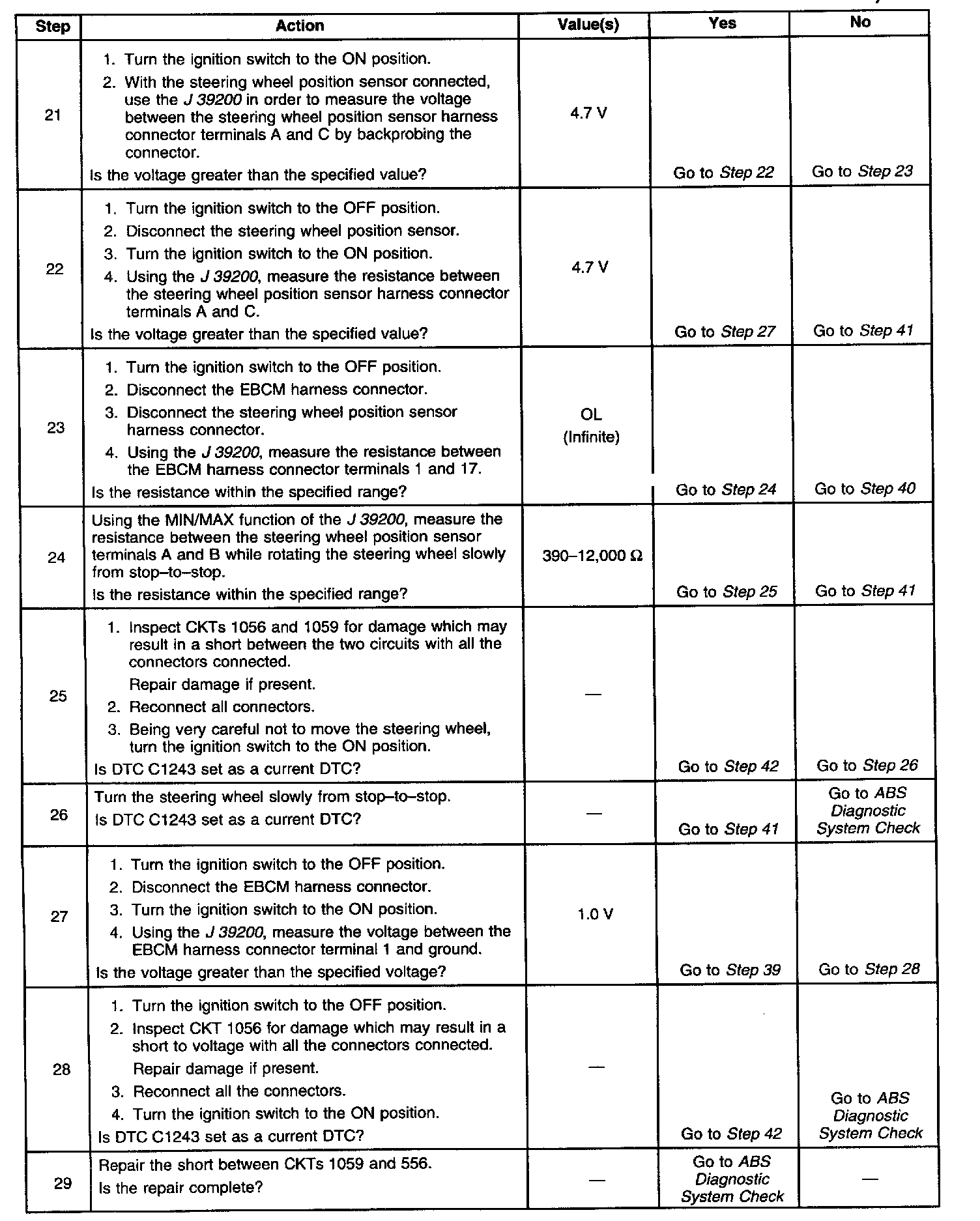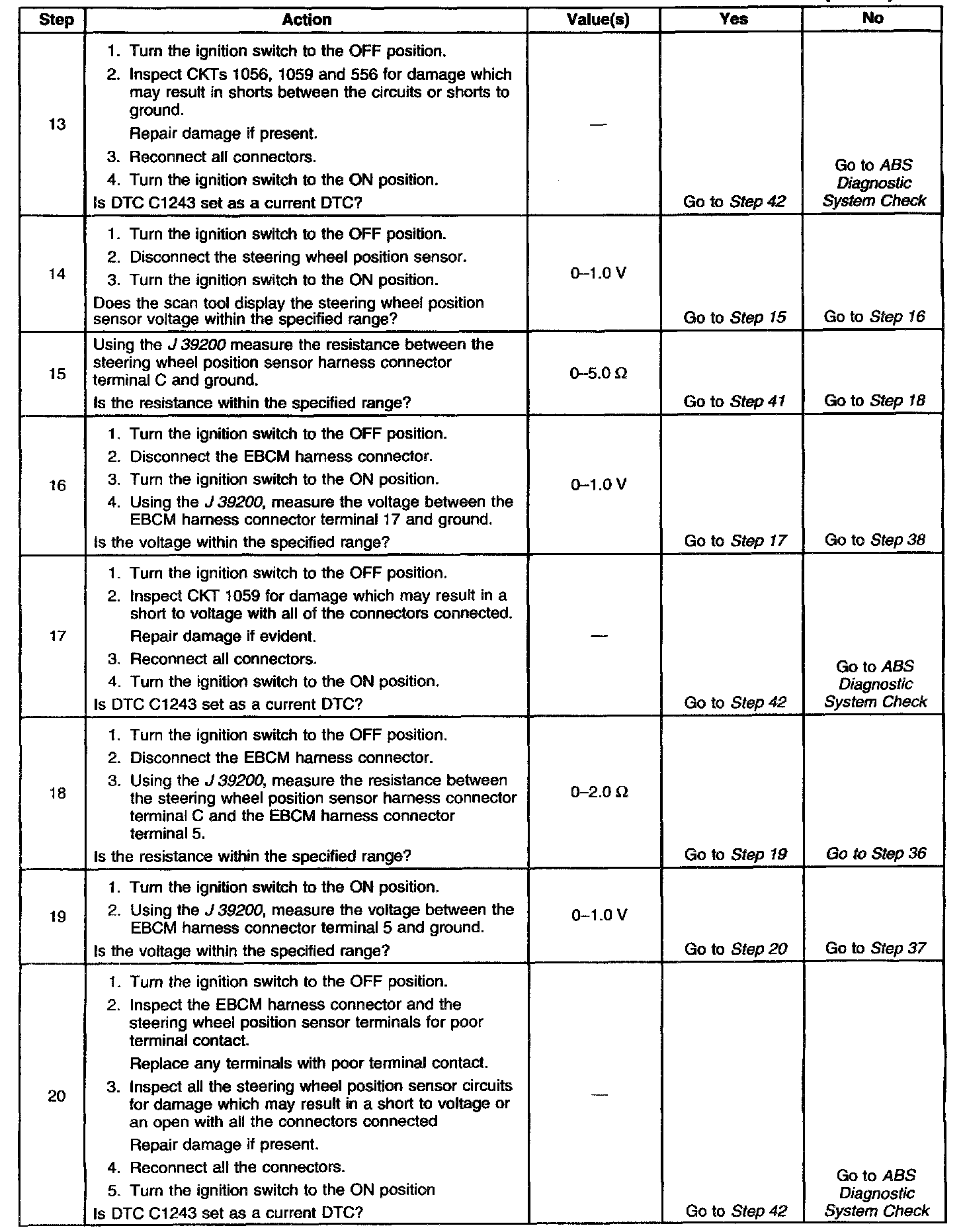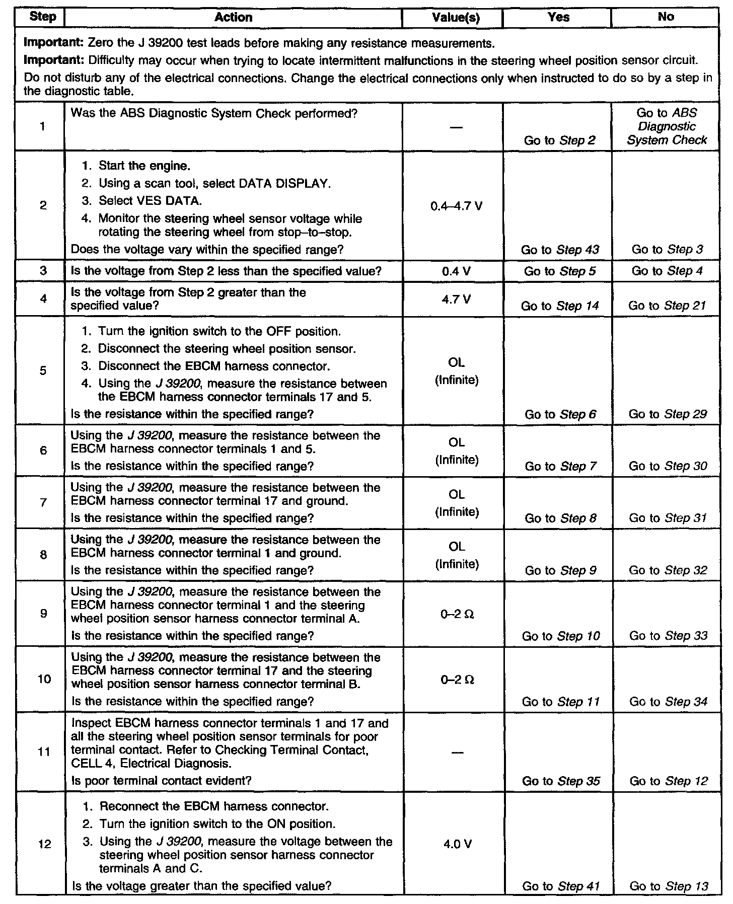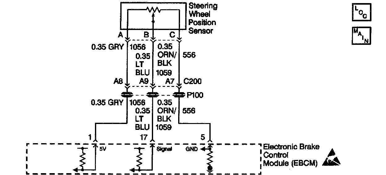 A 5.0 volt reference is supplied to the steering wheel position sensor through the EBCM connector terminal 1 to sensor terminal A. Steering wheel position input to the EBCM is provided through steering wheel position sensor terminal B to the EBCM terminal 17. Steering wheel position sensor ground is provided through the EBCM terminal 5.