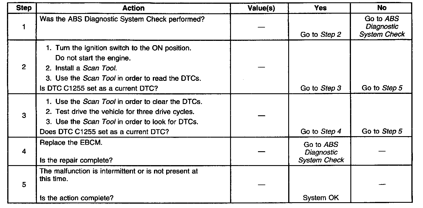 DTC C1255 is set when an internal EBCM malfunction exists.