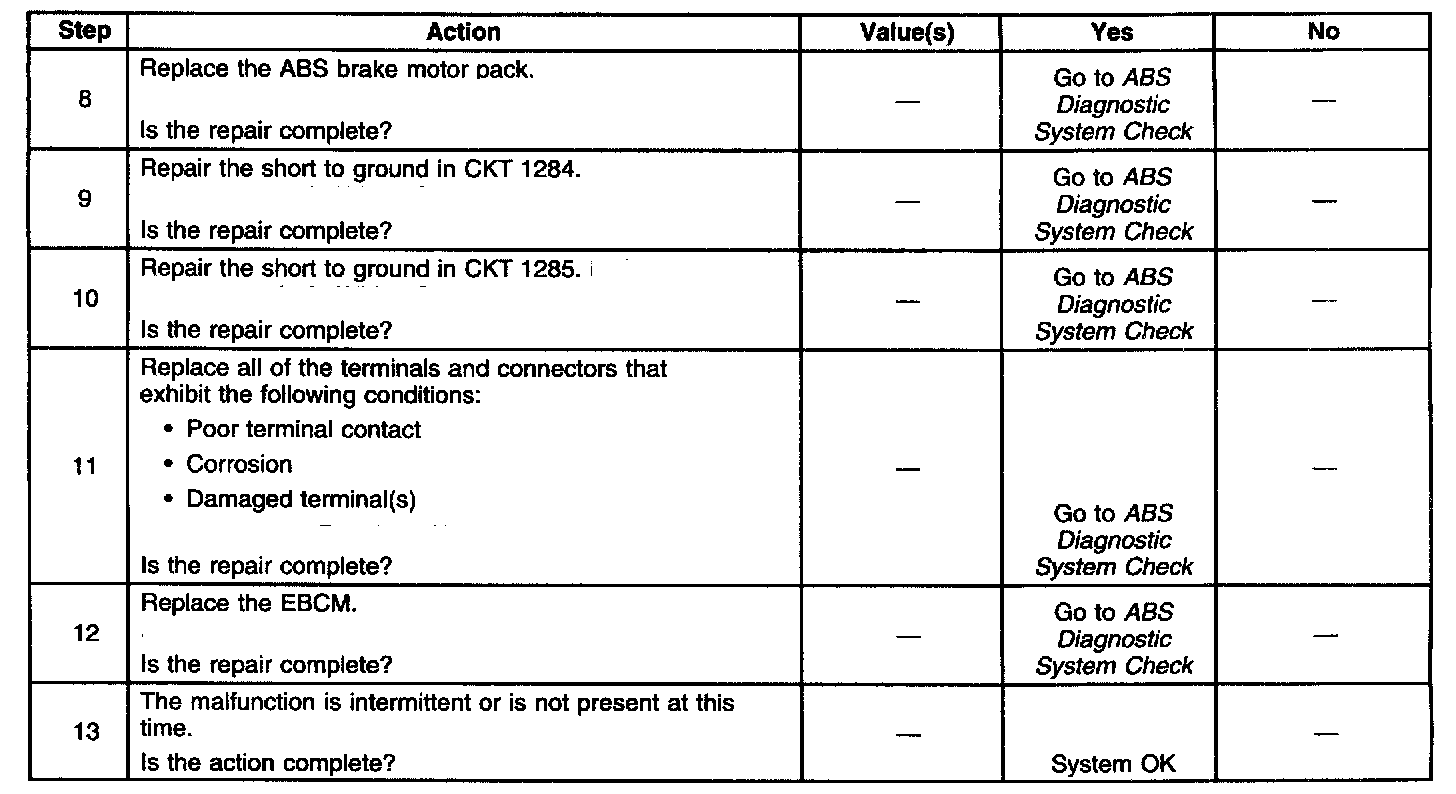 A malfunction exists if the EBCM detects an out of range voltage on either of the rear ABS motor circuits. The out of range voltage on either circuit indicates an open circuit exists.