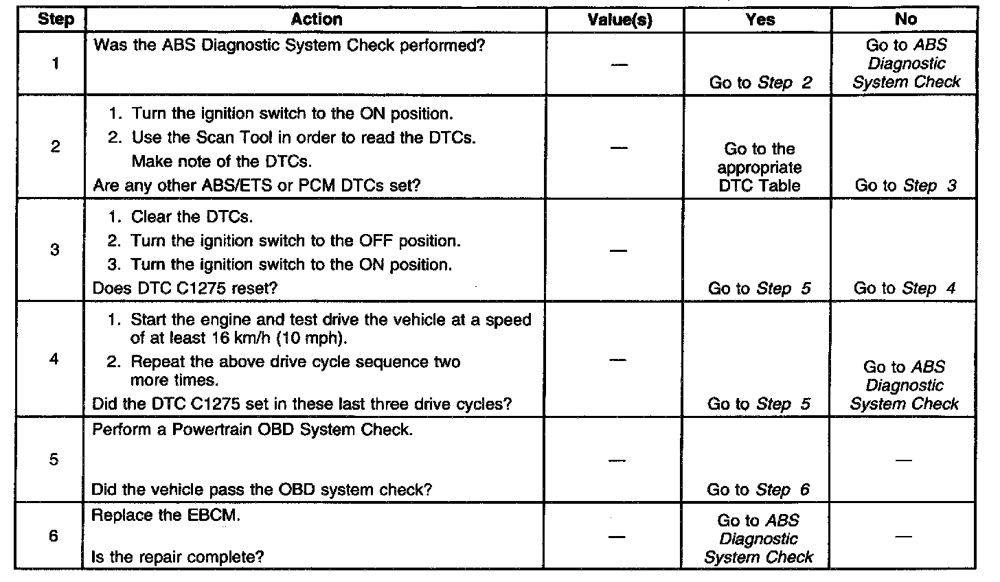 DTC C1275 will set if the EBCM receives a malfunction message from the PCM. The PCM sends this message to the EBCM because of a powertrain malfunction or a loss of class 2 communications from the EBCM to the PCM.