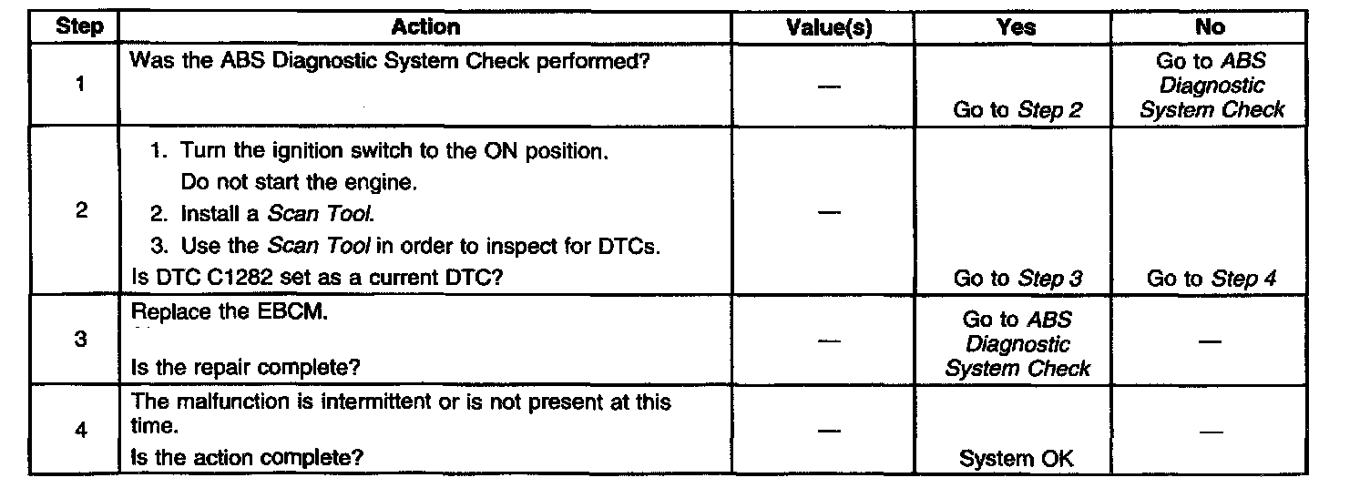 DTC C1282 also acts as a security measure to prevent improper use of calibrations or changes to these calibrations. Improper calibrations may alter the designed function of ABS.