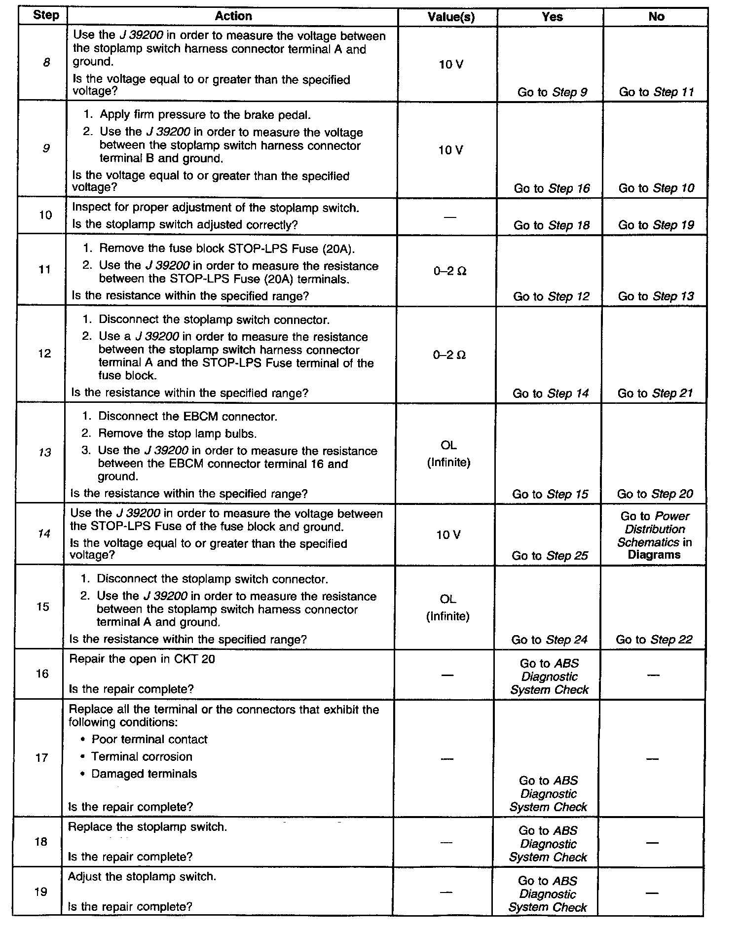 8. This test checks for voltage entering the brake switch.