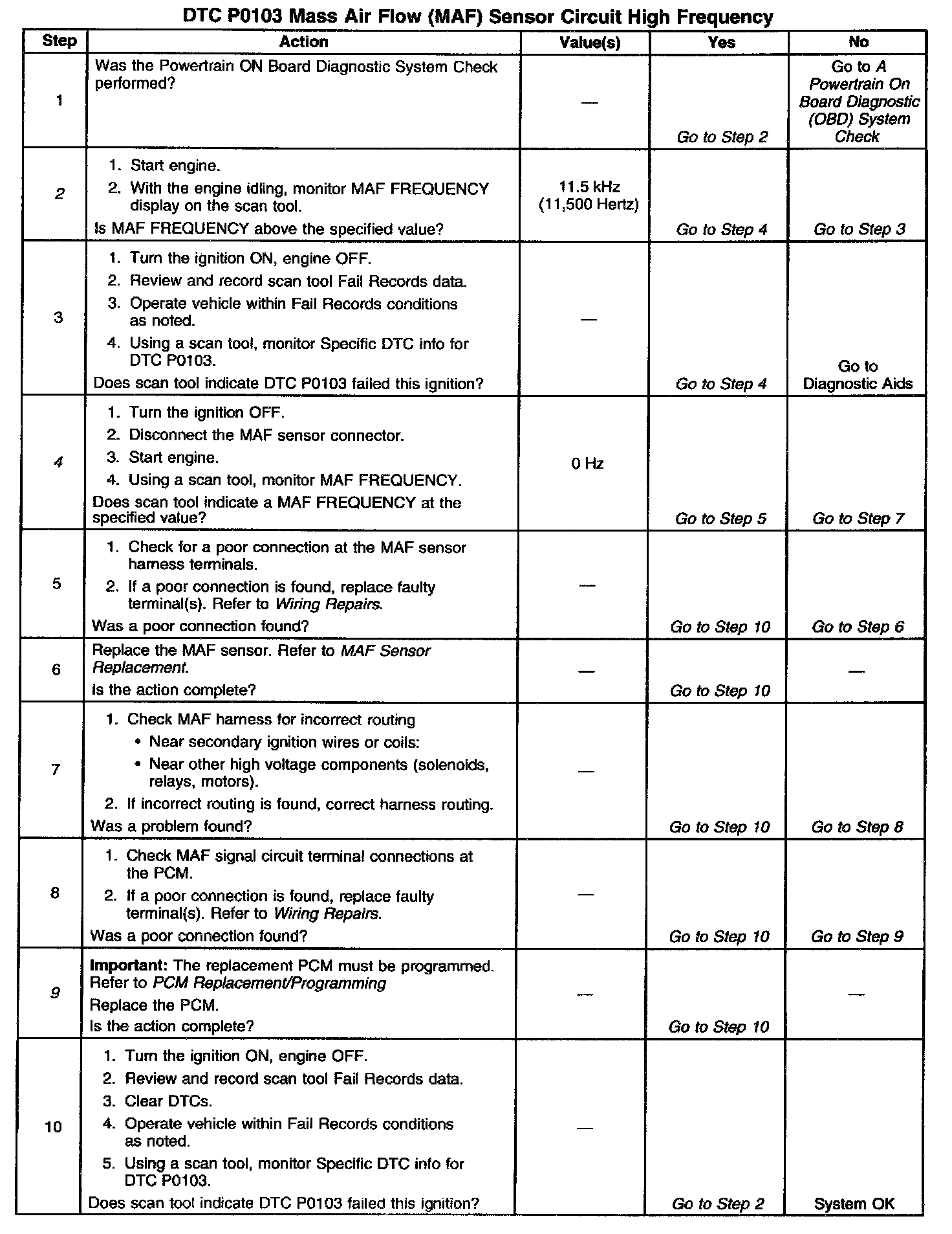 If DTC P0103 cannot be duplicated, the information included in the Fail Records data can be useful in determining vehicle mileage since the DTC was last set.