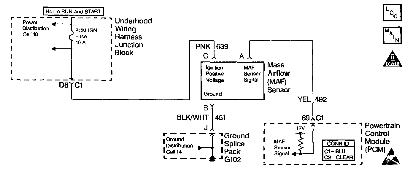 ^ Damaged harness Inspect the wiring harness for damage. If the harness appears to be OK, observe the scan tool while moving connectors and wiring harnesses related to the MAF sensor A change in the display will indicate the location of the fault.