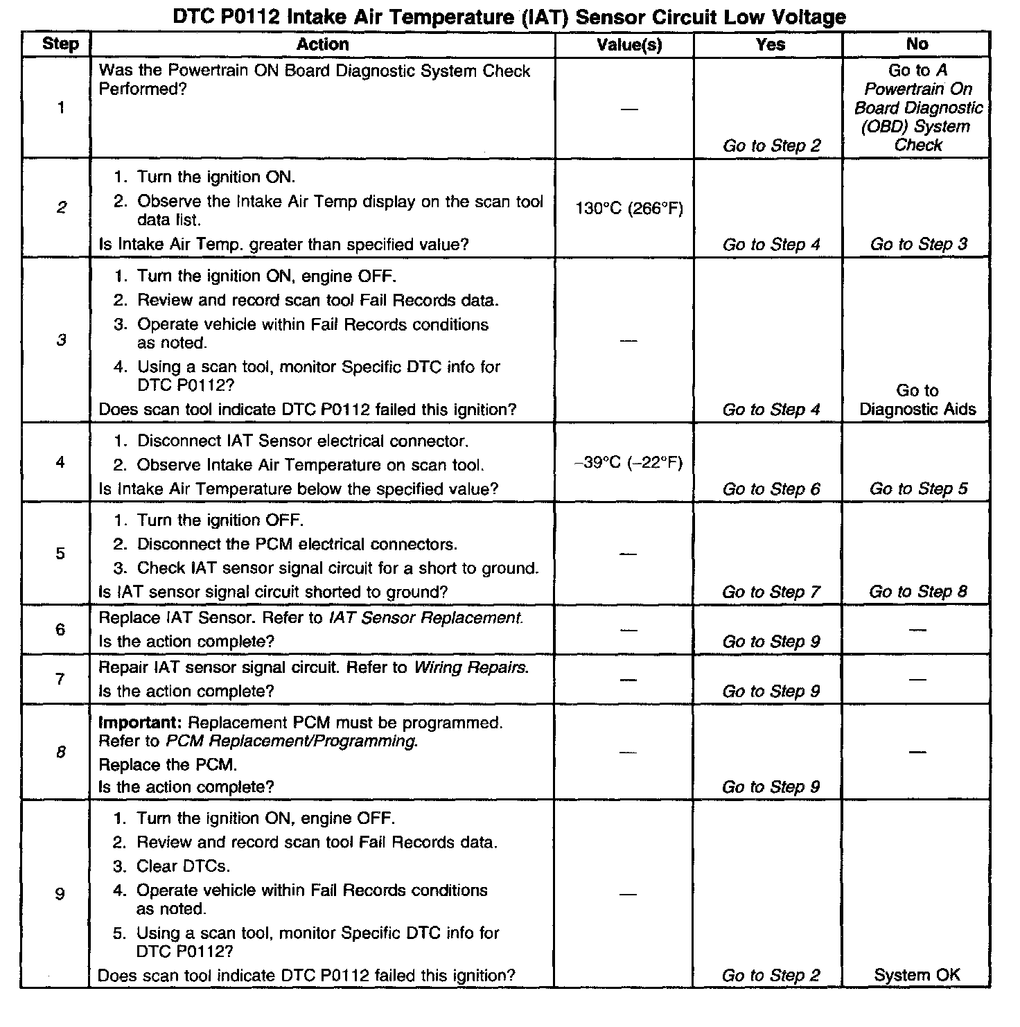3. If DTC P0112 can be repeated only by duplicating the Fail Records conditions, refer to the Temperature vs. Resistance Value table. The table may be used to test the IAT sensor at various temperatures to evaluate the possibility of a shifted sensor that may be shorted above or below a certain temperature. If this is the case, replace the IAT sensor. If the IAT sensor appears to be OK, the fault is intermittent refer to Diagnostic Aids above.