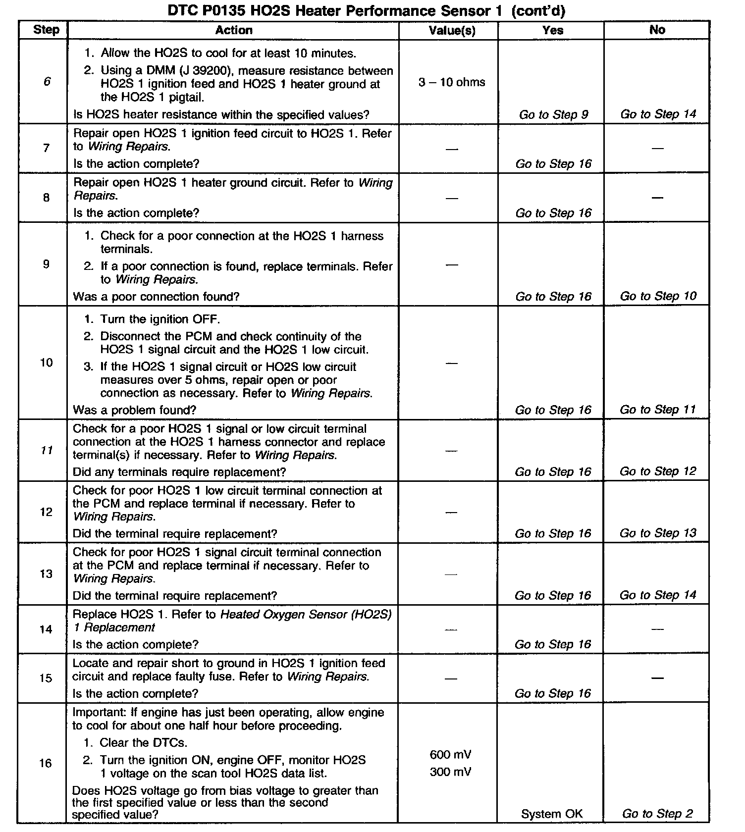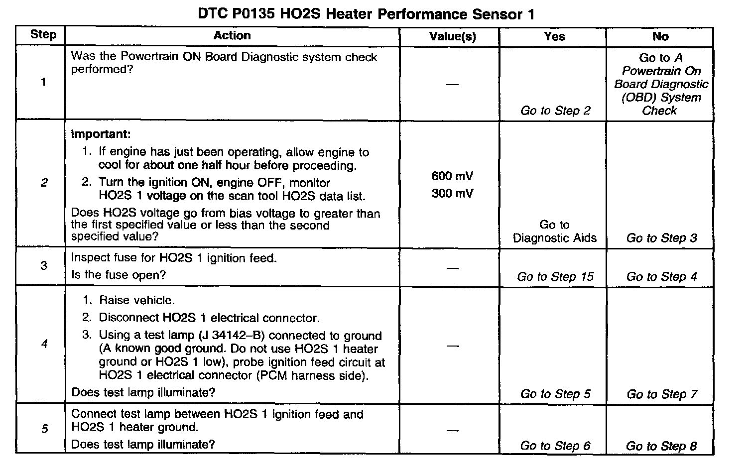 The PCM will run the heater test only after a cold start (determined by engine coolant and intake air temperature at the time of start-up) and only once during an ignition cycle. When the engine is started the PCM will monitor the HO2S voltage. When the HO2S voltage indicates a sufficiently active sensor, the PCM looks at how much time has elapsed since start-up. If the PCM determines that too much time was required for the HO2S 1 to become active, a DTC P0135 will set. The time it should take the HO2S to reach operating temperature is based on the engine coolant temperature at start up and the average Mass Air Flow since start-up (higher average airflow or higher start-up engine coolant temperature = shorter time to HO2S activity).