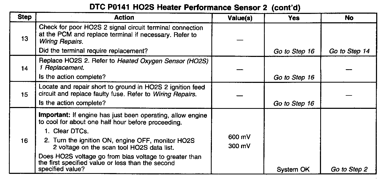 The PCM will run the heater test only after a cold start (determined by engine coolant and intake air temperature at the time of start up) and only once during an ignition cycle. When the engine is started the PCM will monitor the HO2S voltage. When the Bank HO2S voltage indicates a sufficiently active sensor, the PCM looks at how much time has elapsed since start-up. If the PCM determines that too much time was required for the HO2S 2 to become active, a DTC P0141 will set. The time it should take the HO2S to reach operating temperature is based on the engine coolant temperature at start-up and the average Mass Air Flow since start-up (higher average airflow or higher start-up engine coolant temperature = shorter time to HO2S activity).