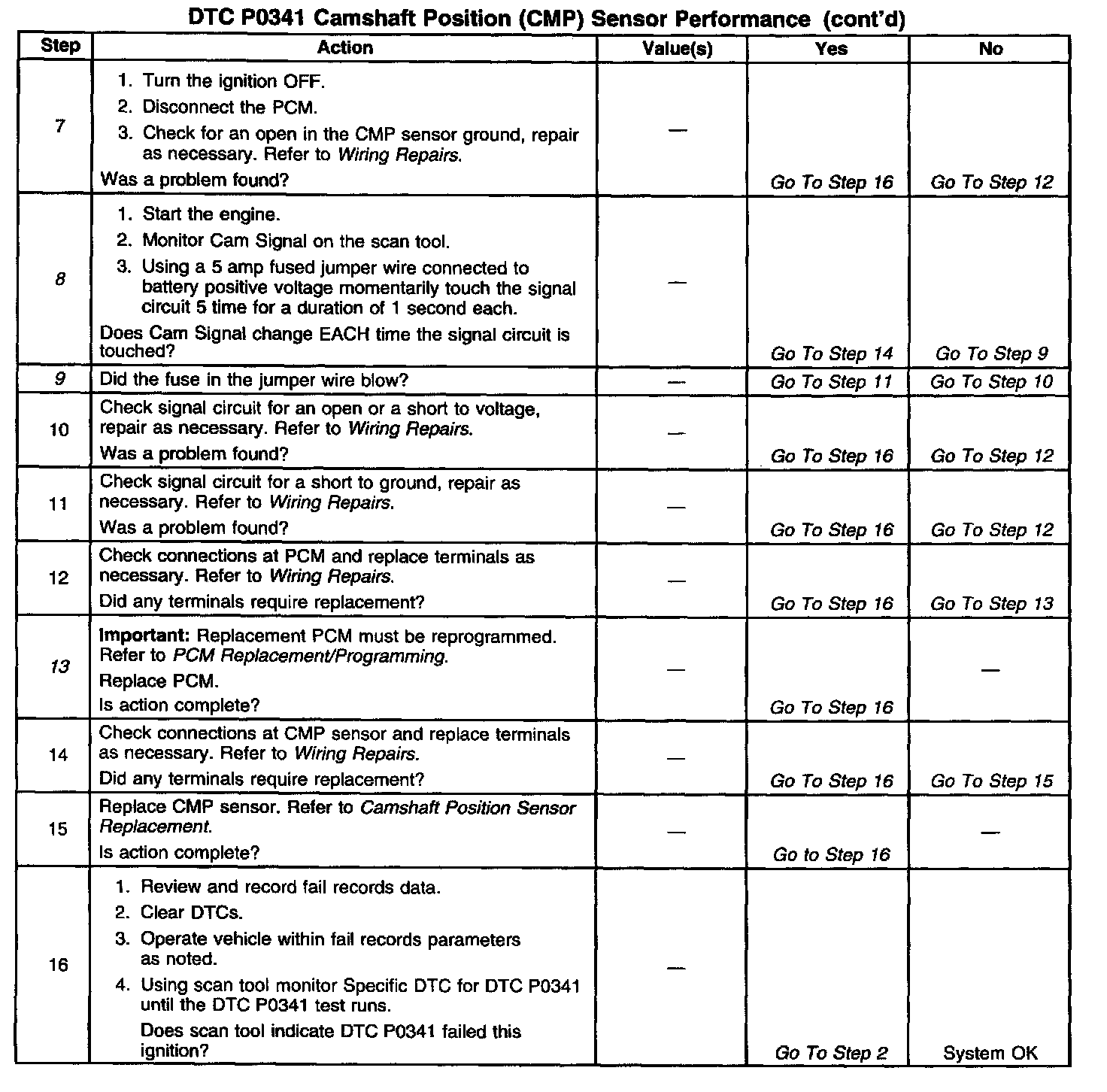 ^ Inspect the wiring harness for damage. If the harness appears to be OK, observe the Cam signal parameter on the scan tool while moving connectors and harnesses related to the sensor. A change in the display may indicate the location of the fault.