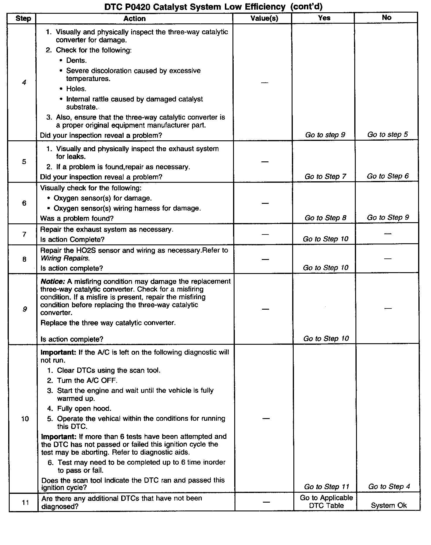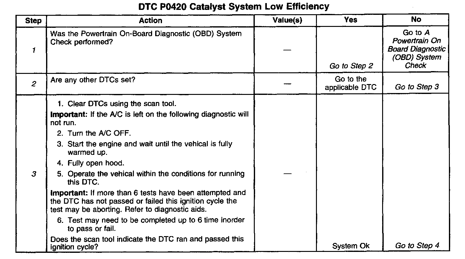 4. This step includes checks for conditions that can cause the three-way converter to appear degraded. Repair any problems found before proceeding with this table.