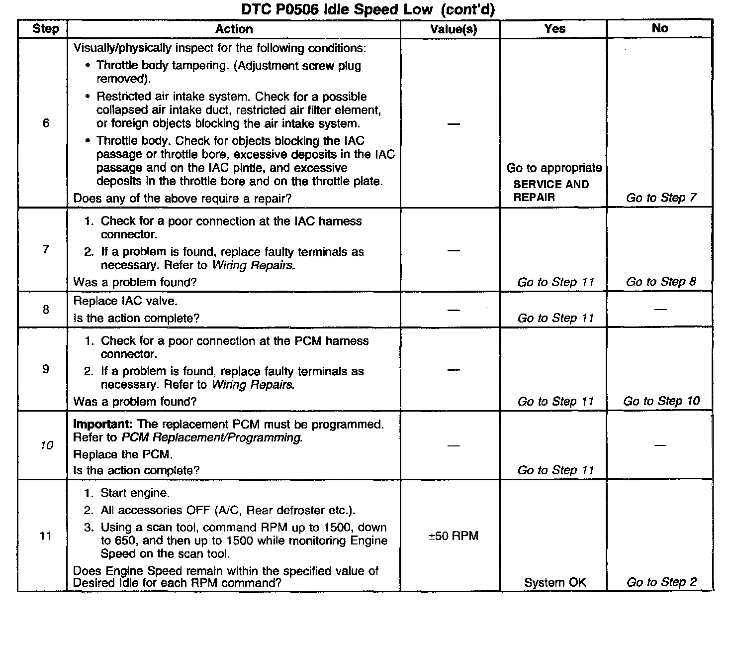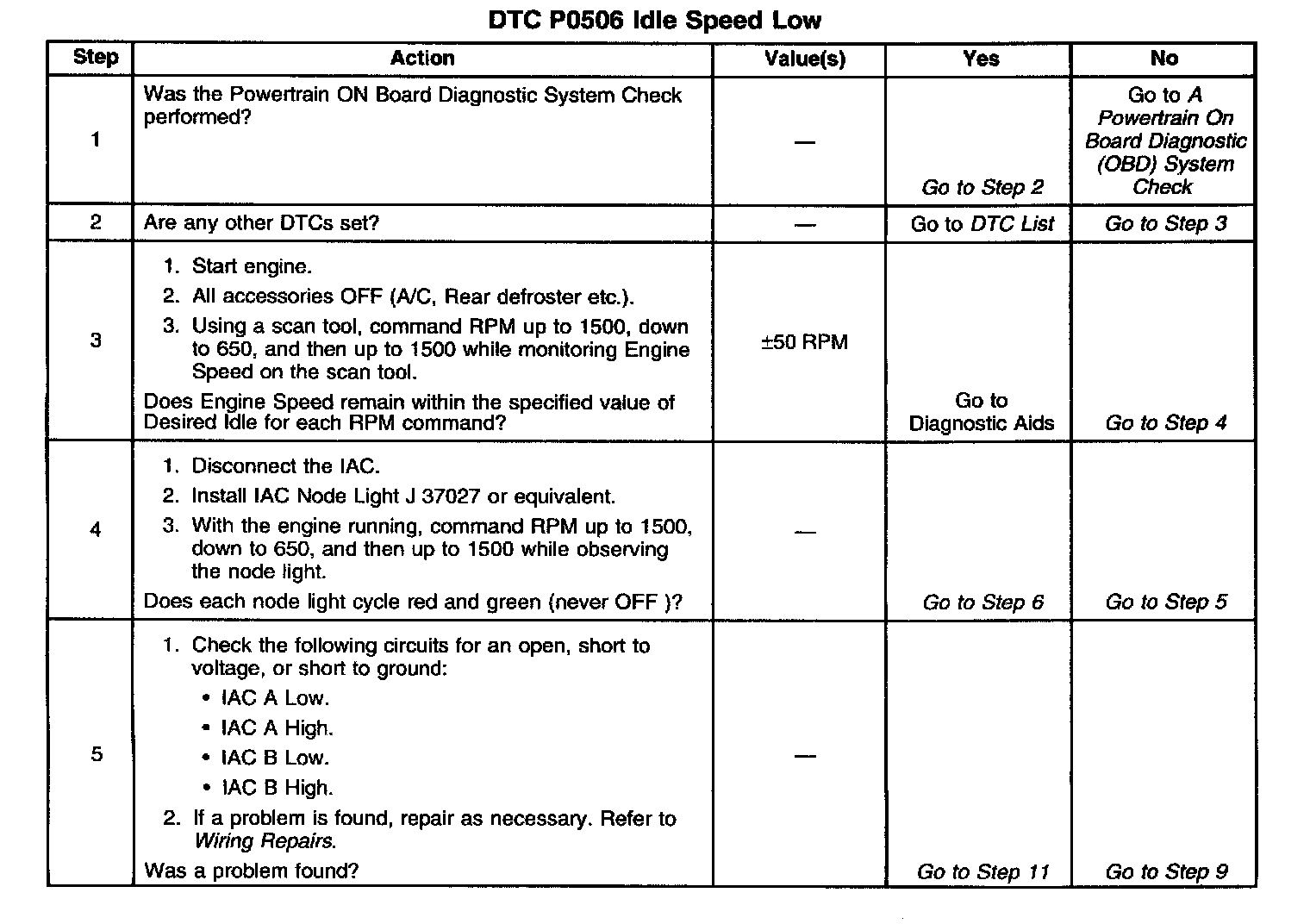 The PCM controls engine idle speed by adjusting the position of the Idle Air Control (IAC) motor pintle. The IAC is a bi-directional motor driven by two coils. The PCM applies current to the IAC coils in steps (counts) to extend the IAC pintle into a passage in the throttle body to decrease air flow. The PCM reverses the current to retract the pintle, increasing air flow. This method allows highly accurate control of idle speed and quick response to changes in engine load. If the PCM detects a condition where too low of an idle speed is present and the PCM is unable to adjust idle speed by increasing the IAC counts, DTC P0506 will set indicating a problem with the idle control system.