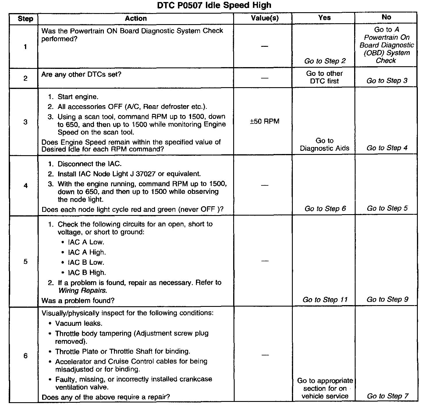 The PCM controls engine idle speed by adjusting the position of the Idle Air Control (IAC) motor pintle. The IAC is a bi-directional motor driven by two coils. The PCM applies current to the IAC coils in steps (counts) to extend the IAC pintle into a passage in the throttle body to decrease air flow. The PCM reverses the current to retract the pintle, increasing air flow. This method allows highly accurate control of idle speed and quick response to changes in engine load. If the PCM detects a condition where too high of an idle speed is present and the PCM is unable to adjust idle speed by decreasing the IAC counts, DTC P0507 will set indicating a problem with the idle control system.