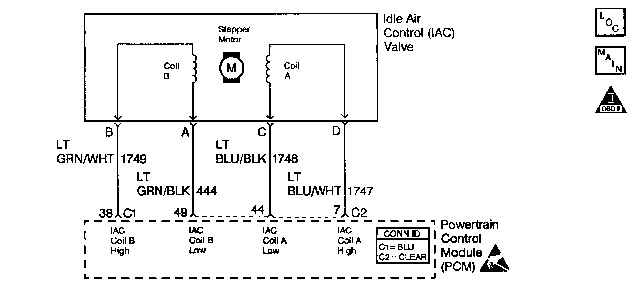 ^ Poor connection at PCM or IAC motor. Inspect harness connectors for backed out terminals, improper mating, broken locks, improperly formed or damaged terminals, and poor terminal to wire connection