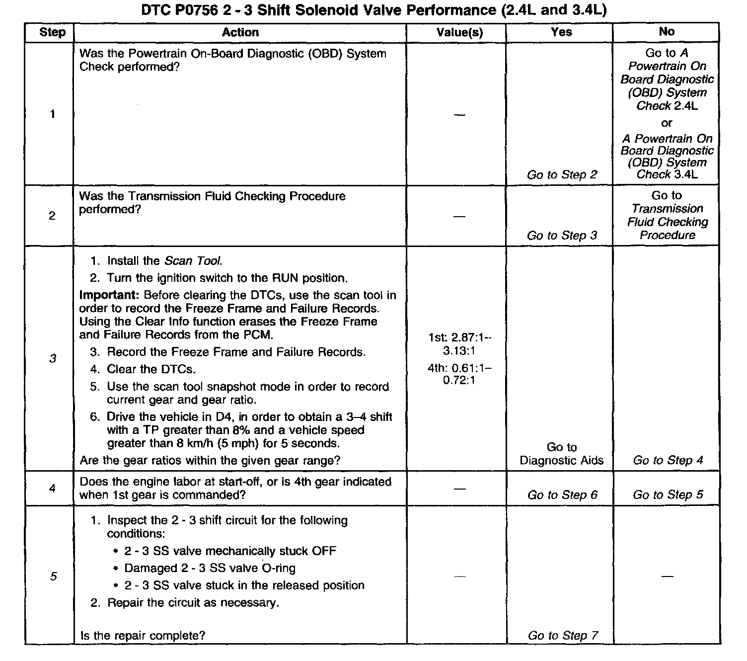 The PCM monitors the actual gear ratio and compares the actual gear ratio with the commanded gear ratio. DTC P0756 sets under four conditions:
