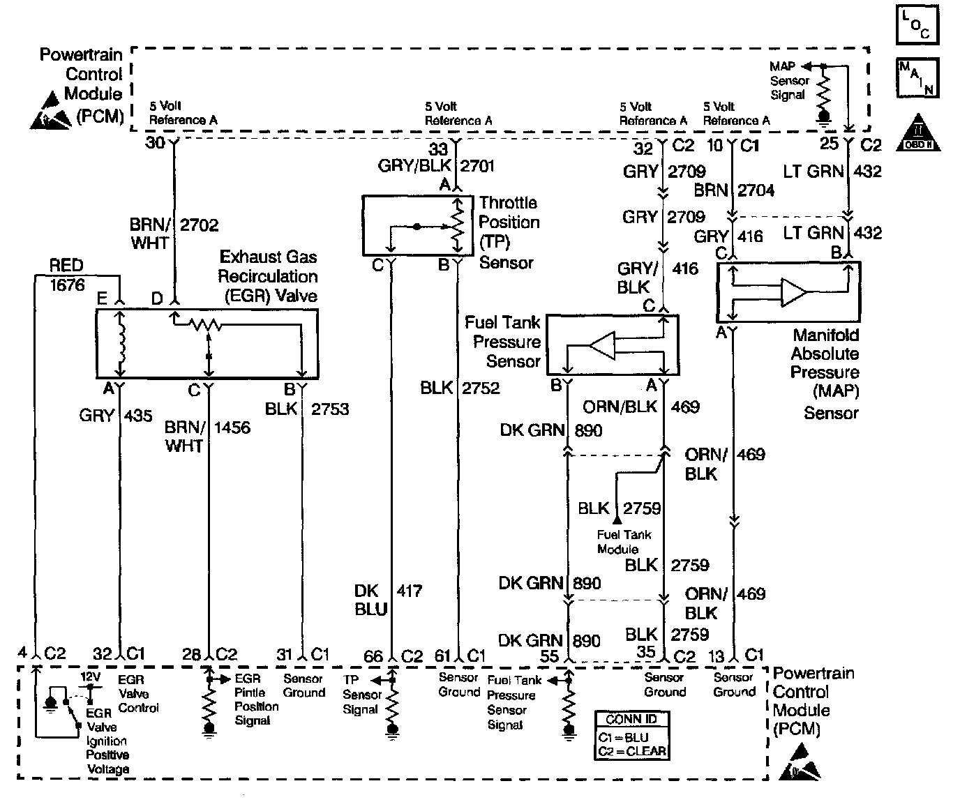 The MAP sensor is used to determine manifold pressure changes while the linear EGR flow test diagnostic is being run (refer to DTC P0401), to determine engine vacuum level for some other diagnostics and to determine barometric pressure (BARO). P0401