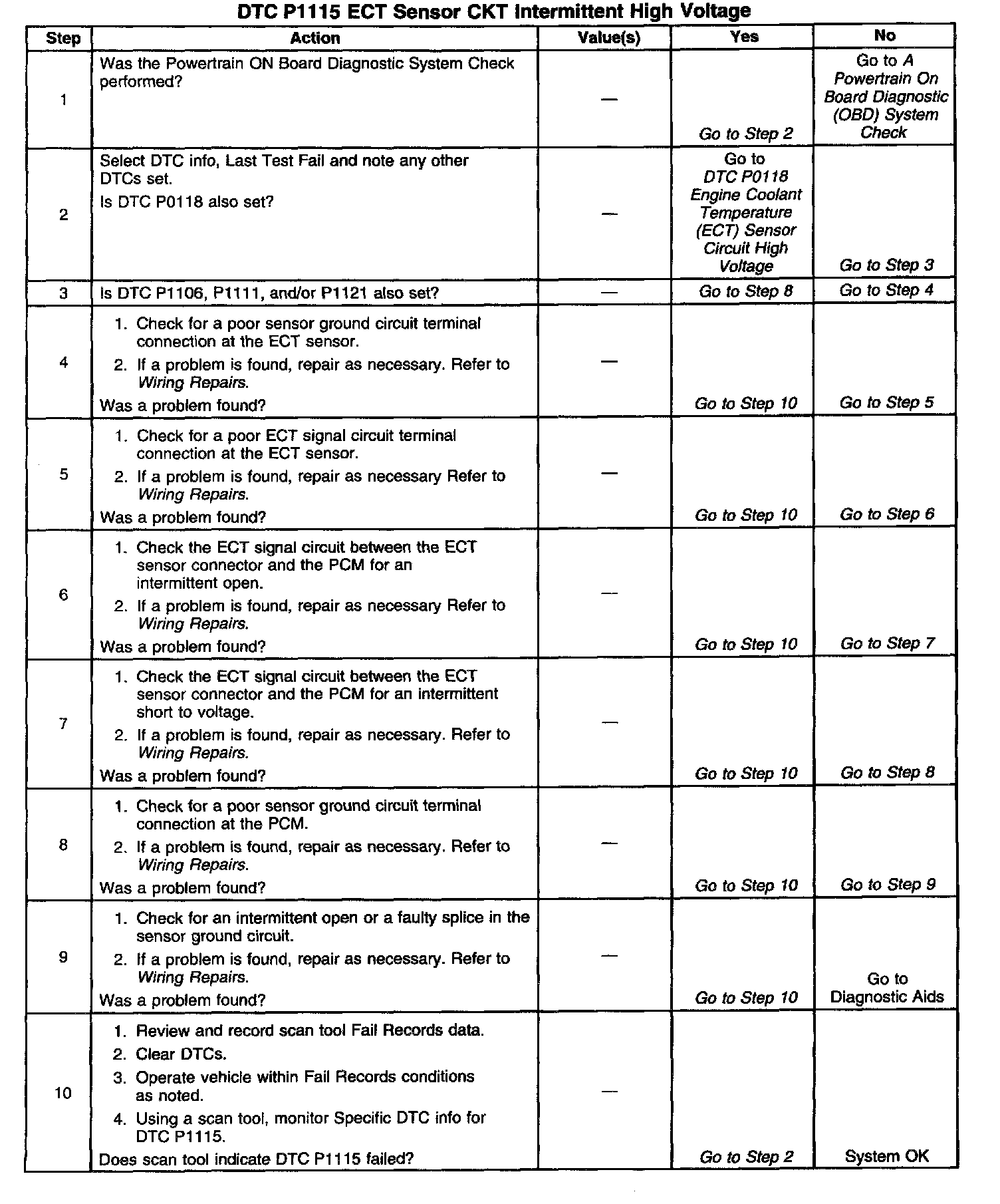 The Engine Coolant Temperature (ECT) sensor is a thermistor mounted in the engine coolant stream. The PCM applies a voltage (about 5.0 volts) through a pull up resistor to the ECT signal circuit. When the engine coolant is cold, the sensor (thermistor) resistance is high; therefore the PCM will measure a high signal voltage. As the engine coolant warms, the sensor resistance becomes less, and the ECT signal voltage measured at the PCM drops. With a fully warmed up engine, the ECT signal voltage should measure about 1.5 to 2.0 volts. If the PCM detects an ECT signal that is intermittently above the range of the ECT sensor, DTC P1115 will set.